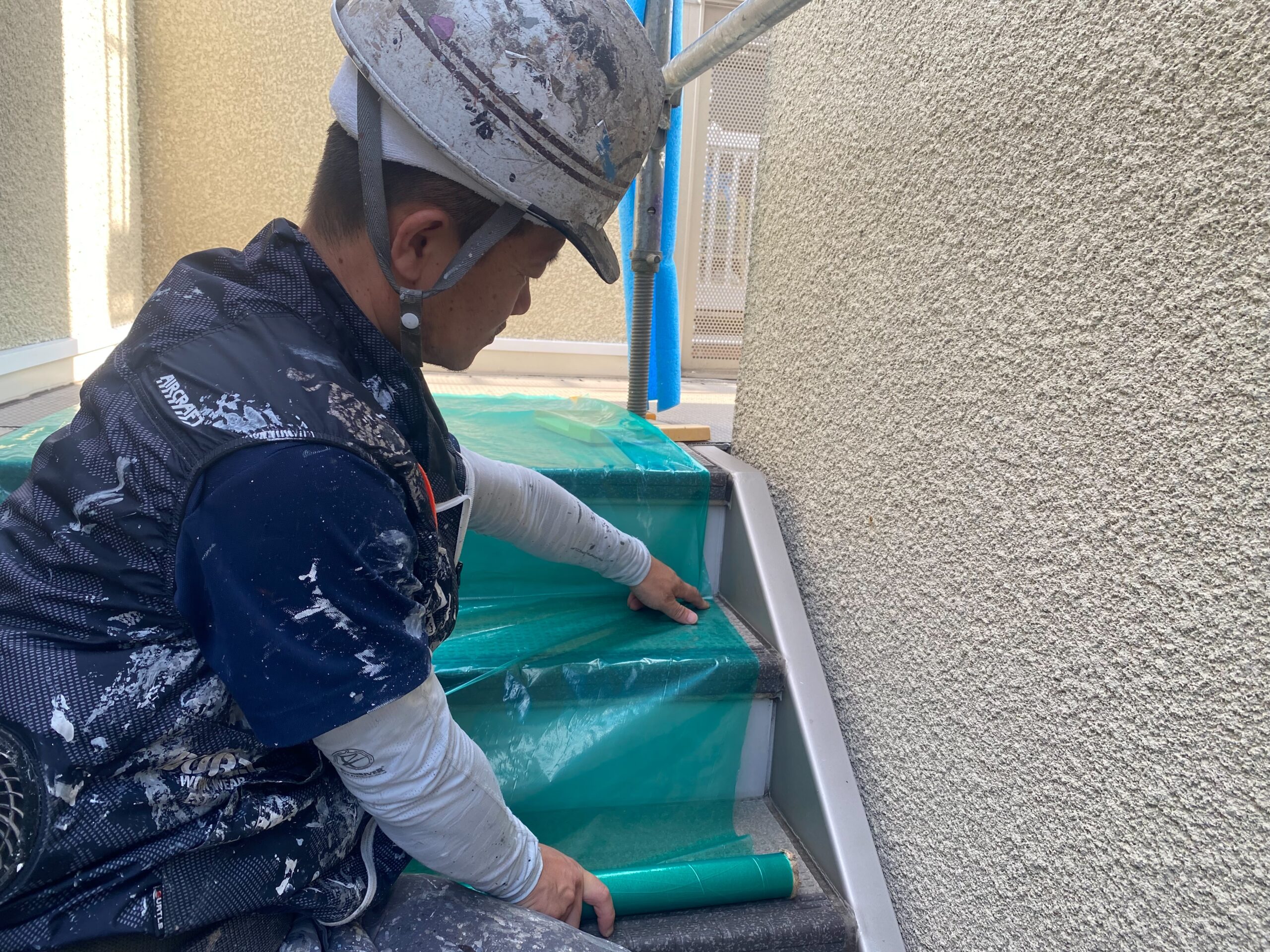 人が通る箇所はこのグリーンのシート。ブルーシートでは雨天時に滑る為転倒によるケガが心配となるんです。グリーンのシートはノンスリップです!少し高いシートですが、居住者様や私達がケガすることを考えると絶対に迷わずこちらになりますね✨