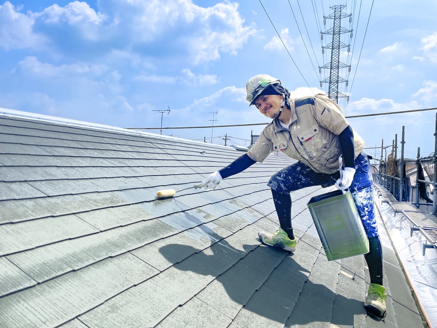 そしてこちらも屋根の上での、塗装作業🌞居住者様の中にはまだ寝ている方もおられるかも知れませんので最低限の足音できっちり✨見えない箇所でもしっかりと笑顔を忘れずに作業を(笑)施工写真のついでにブログ用の写真を撮影📷佐藤親方は屋根で撮影すると決まってこのポーズ…お気に入り?