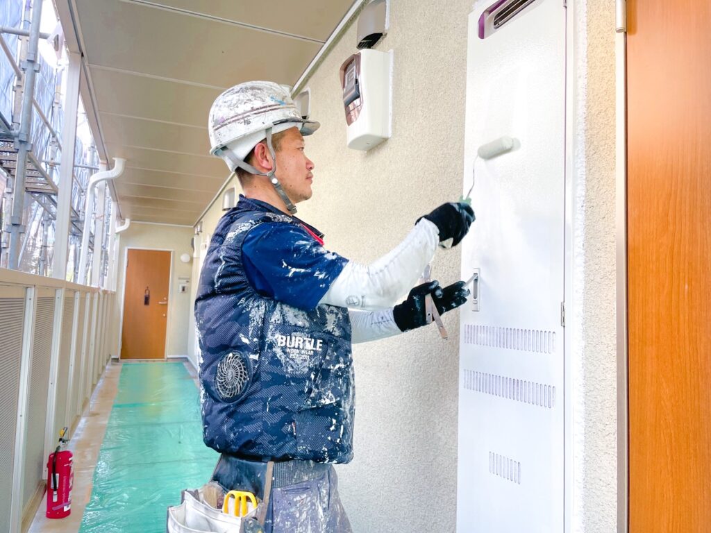 また玄関前にある為作業前には必ずインターホンでお知らせをしてから作業開始。知らないと大切なバッグやお洋服に塗料が付着してしまいますから💦