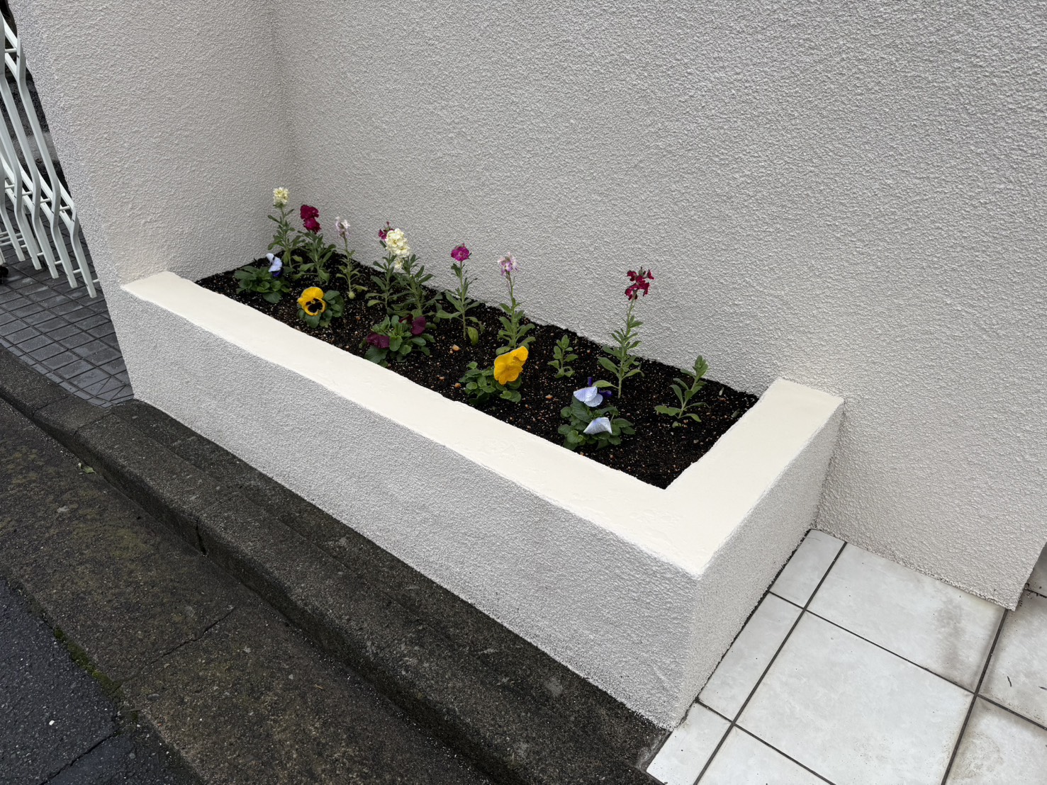 本日は休日。この寒い中頑張っている職人はお休みです。私は門塀とベランダ防水工事をご依頼して頂いたお客様のお宅へ工事の引渡としてご挨拶に伺わせて頂きました。塀の塗装の為花壇は一時的に植木などを移動して頂いておりましたが、なんと👀可愛らしい花壇へと変わっておりました✨塀も綺麗になりお花も一段と綺麗に見えました。なんか良いですねこの様な感じや流れは。またお花を大切にするお客様。お花を大切にする方はみんな優しい方です!店舗前のお花は一時撤去しましたが暖かくなったらまた出そうと思います。優しい人になる為に✨