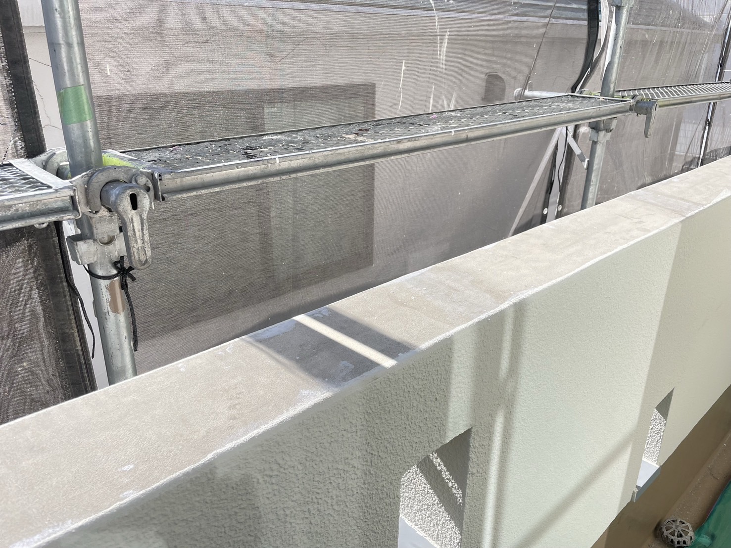 今回は手摺壁の天場のウレタン防水です。手摺壁に大きなクラックが発生していたり、脆弱部があった為、雨水の侵入の危険性がありました。その為、塗装より防水の方がより安心して生活を送れる方法でしたので代表がご提案してお客様もご納得してこの様な仕様になりました。