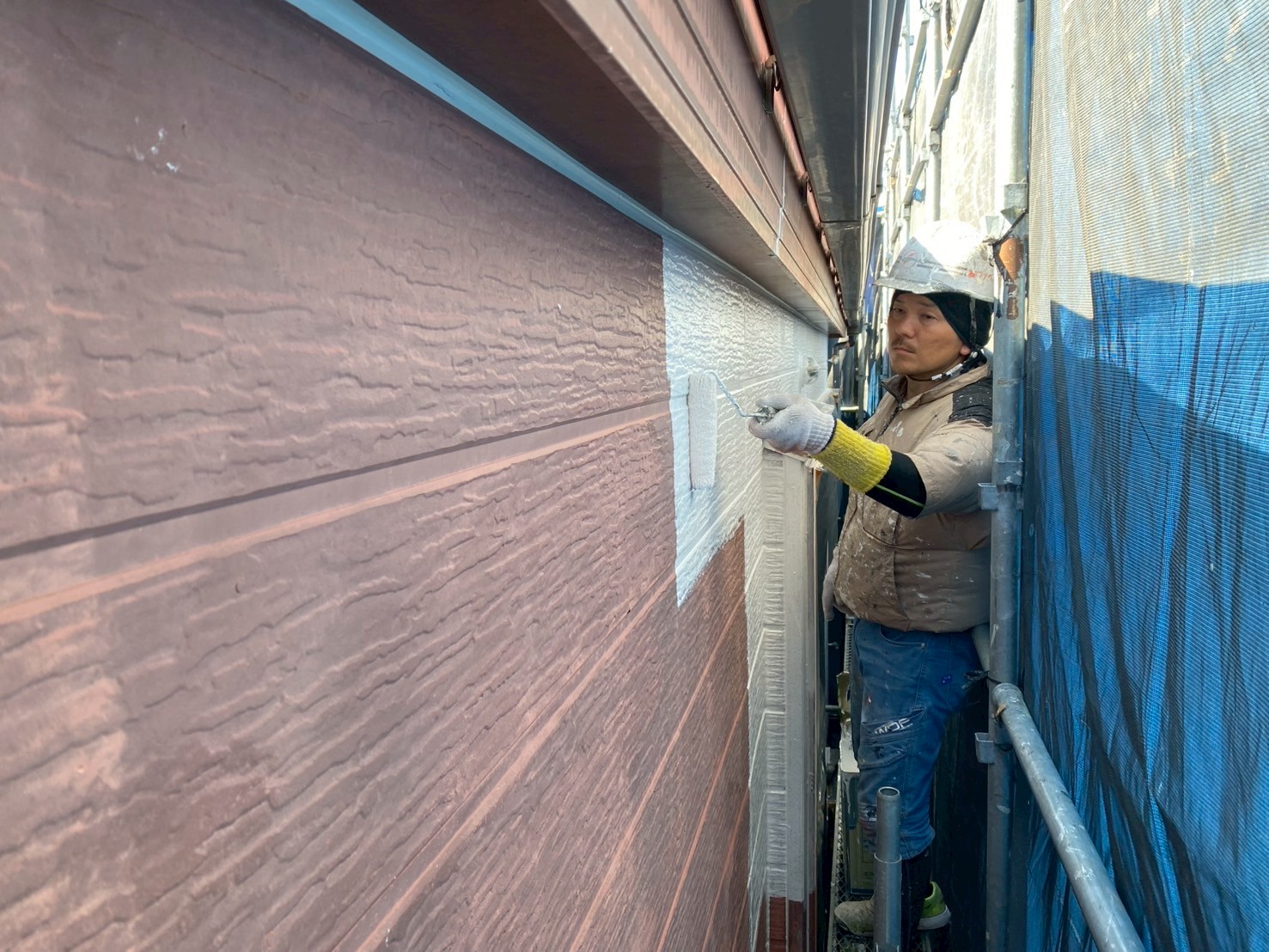 隣が近いので大きなブルーシートで全面覆っています。この季節はあっついです💦塗り残しが無いように🥺下塗りと中塗りのインターバルは皆さんご存じでしょうか?👀大体の塗料は3時間です⌚3時間なので一日の作業進捗はせいぜい中塗り迄となります。一日で塗り終えることは不可能ですので塗り始めた日から3日間立たないと養生は剥がせません。覚えておいてくださいね。手抜きや低品質の塗装を防止出来ます!