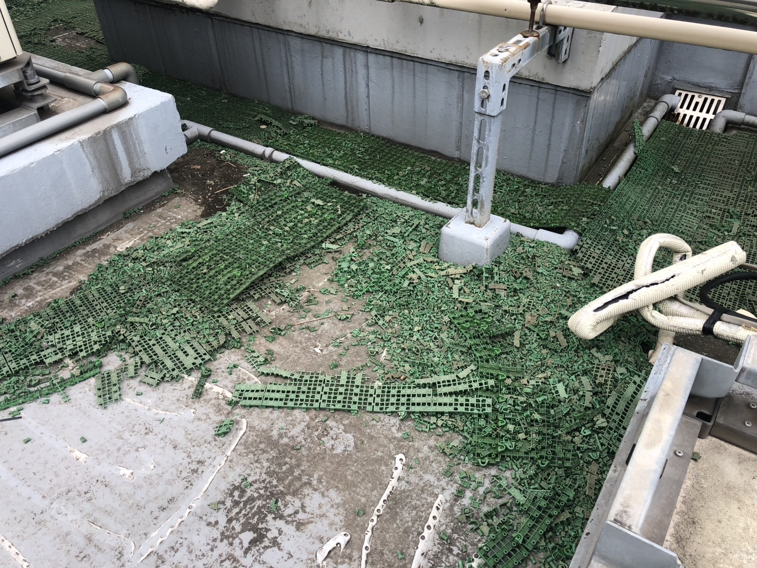 人工芝にもかなり劣化が起きており砕けた破片が排水溝に入ってしまい詰まらせていました。少しずつ排水する事は出来ていますが、オーナーさんがおっしゃっていた、強い雨の日のみ漏れるという事は溜まった雨が亀裂などから侵入していたと考えられました。今回は人工芝を撤去して躯体補修と全面ウレタン防水の施工をご提案させてもらいました。