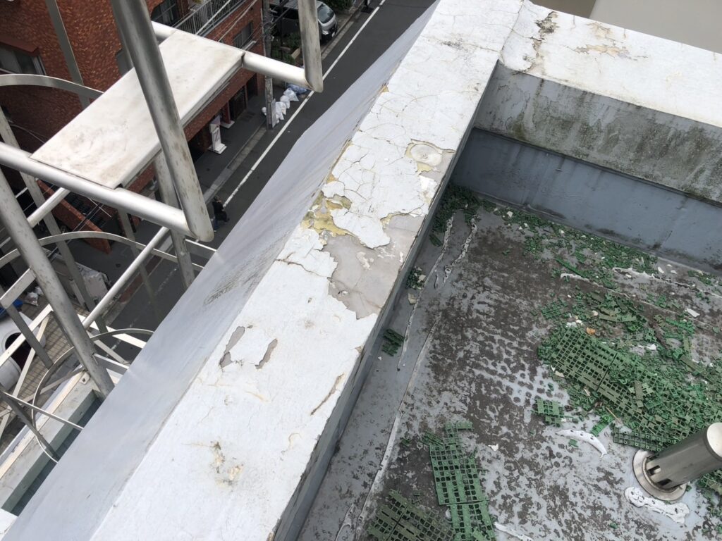 実際に現場に向かい、まずは屋上に上がって防水層の確認を行いました。まず目に付いたのが、笠木部分のモルタルの剥がれでした。構造クラックも発生しており躯体部分に大きな劣化が見受けられました💦その他にもにもウレタン防水部分やシーリング箇所にも剥がれや亀裂があり、そこからの原因と考えられました。