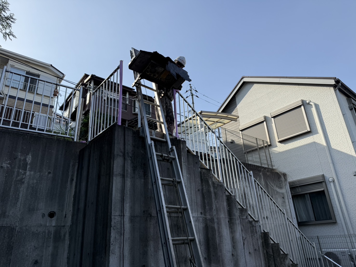 建物から駐車場まで当現場は長い階段となります。手運びではとても厳しく辛い作業となります💦でも❣屋根工事で使用する梯子は一味違います✨通常の梯子は登るだけですが、屋根工事で使用する場合はワイヤーなどを取付、台を取付、自動で動いてくれます✨屋根材はとっても重いです。1㎡10キロ位の重さがありますので、今回撤去した屋根材の重さはなんと600㎏👀人力では辛いです💦