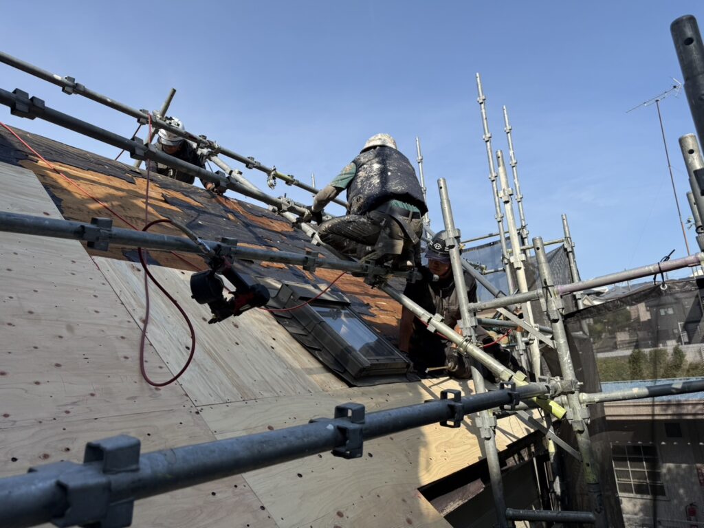 屋根の下地の腐食があった為ベニヤを新設し新しい下地を作っております。急斜面なのでみんなで協力して落とさないように💦