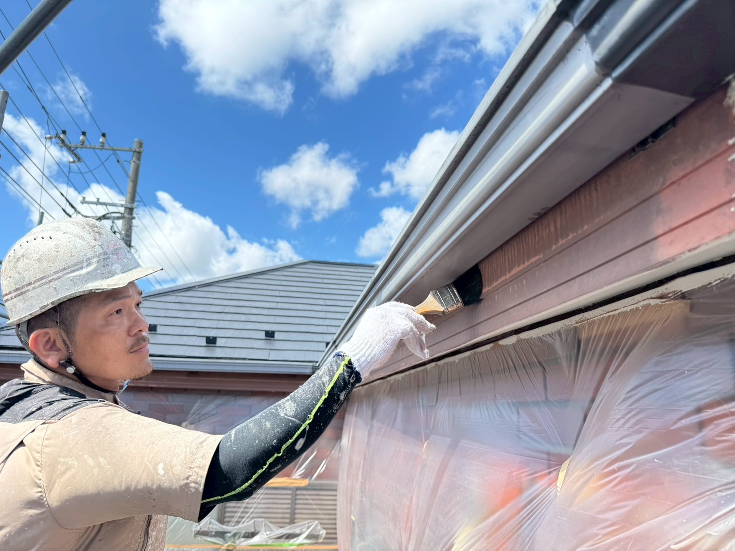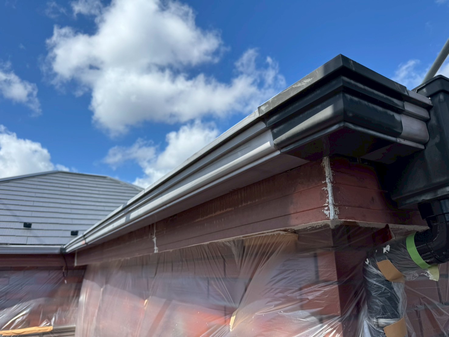 作業は軒樋と破風板の塗装を行っていきます!とっその前に、見て下さいこの青空を!気持ちがよくなる見事な青空ですね☻晴天のおかげで作業もはかどります✨職人をしているとこの様な景色を見れたり季節を感じれたりする所が私は好きです☻