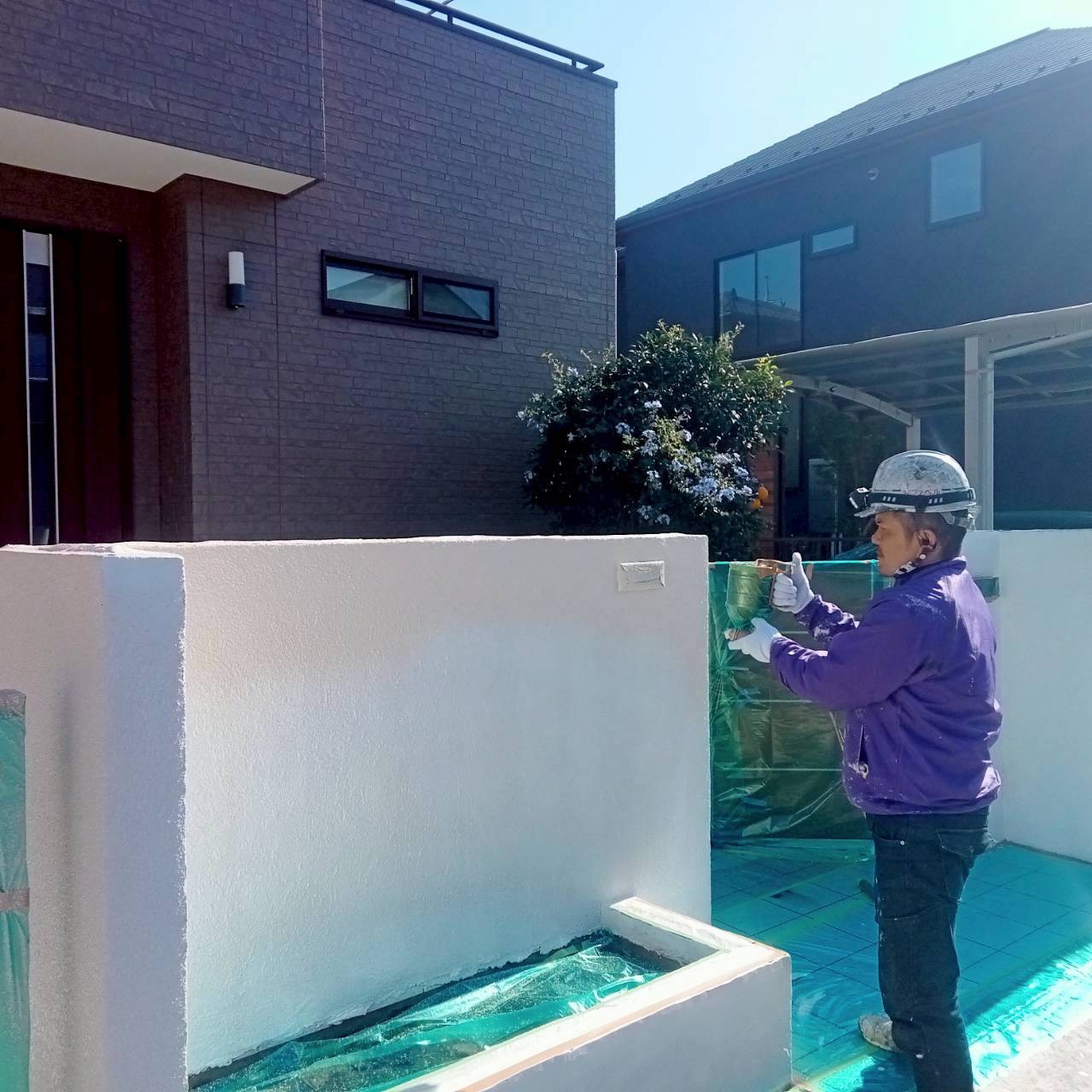 今回は外構と言う事もあり、艶消しでシンプルに上品に✨ジョリコートで吹付です!施工写真のモデルは佐藤に譲る(笑)