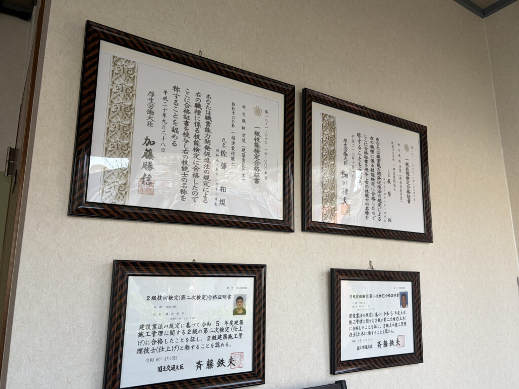一級塗装技能士、二級土木施工管理技士、外壁診断士、建築物石綿含有建材調査者、高所作業車運転、職長安全衛生責任者、有機溶剤作業主任者、足場組立作業主任者、ゴンドラ特別教育、酸素欠乏危険作等、フルハーネス型安全帯使用作業特別教育