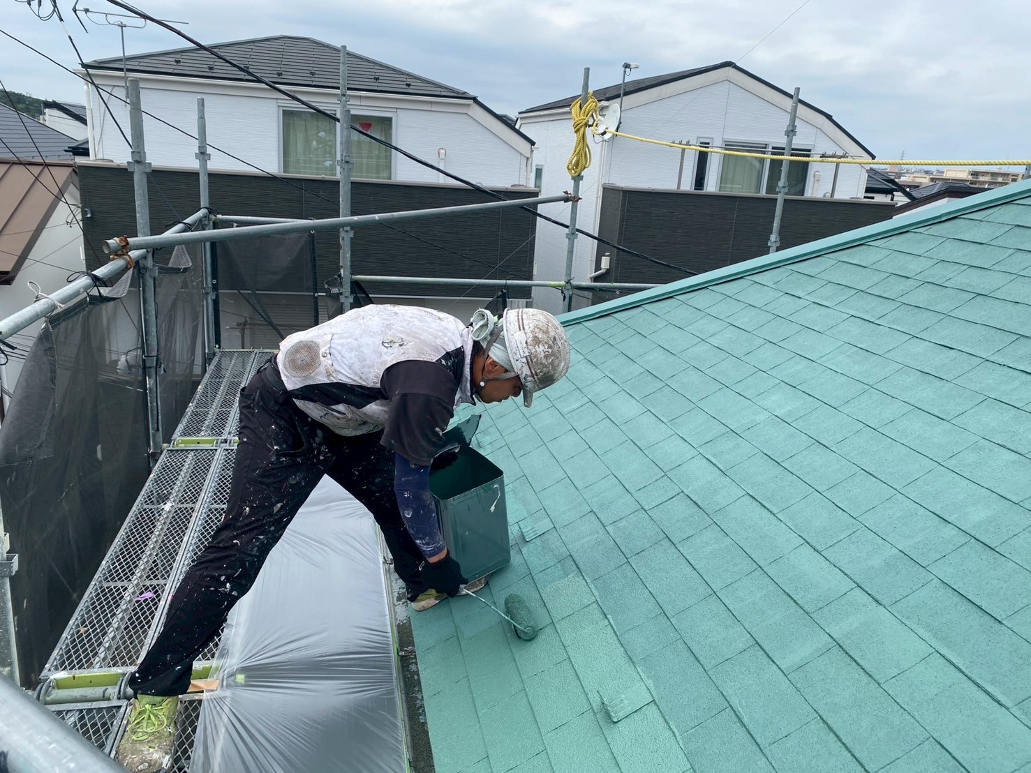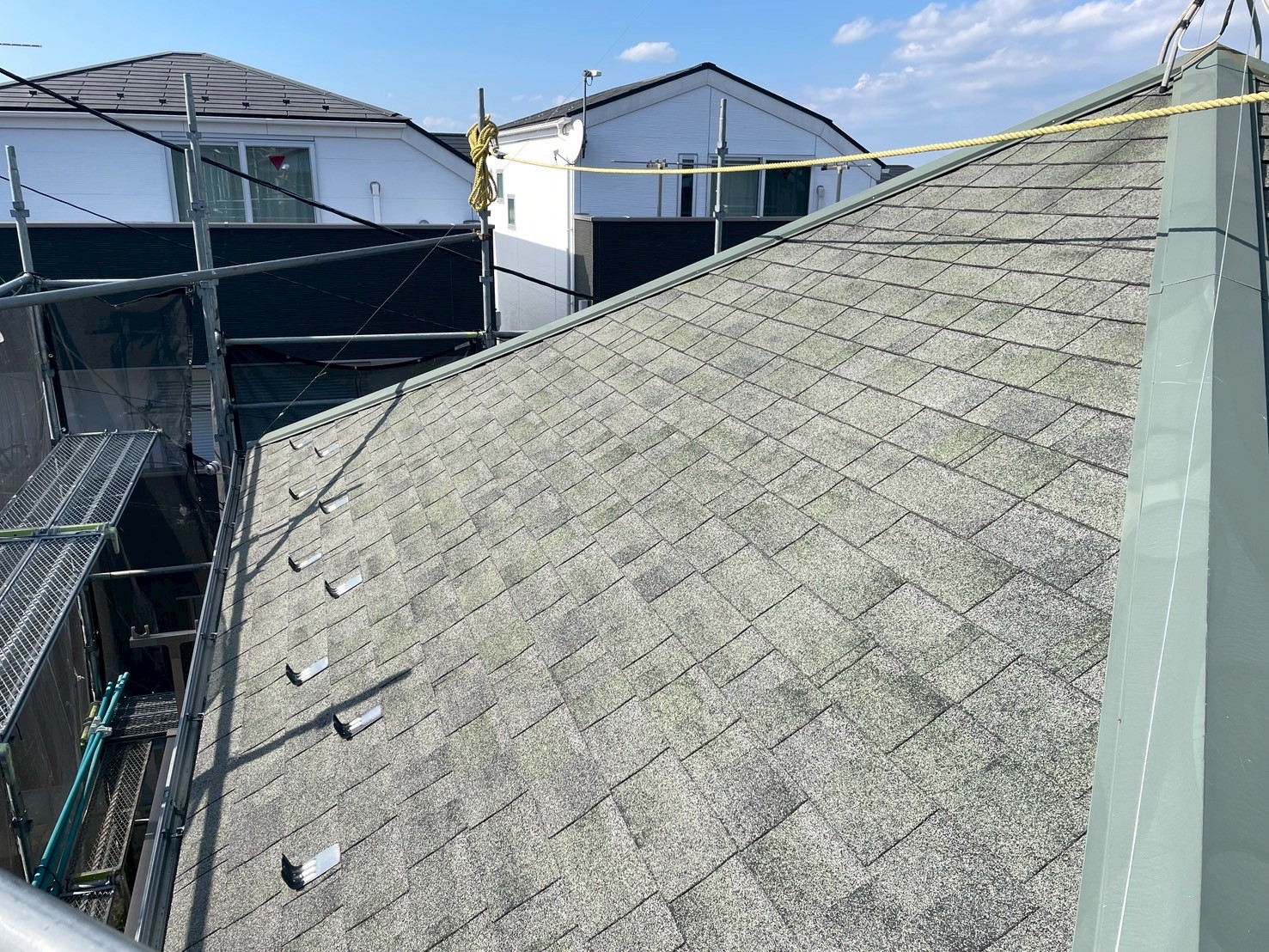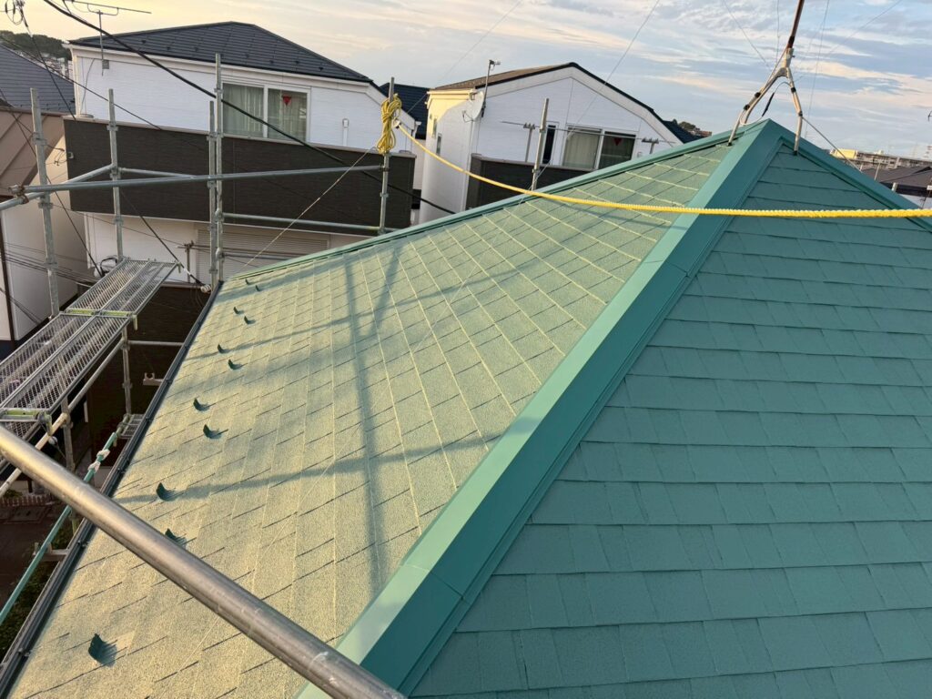 本日はアスファルトシングルの屋根塗装工事。シングル屋根は葺き替えやカバー工法で使われる比較的コストパフォーマンスが高い屋根材です。塗装も1回目(10年目)は行わなくて2回目からの塗装となります!