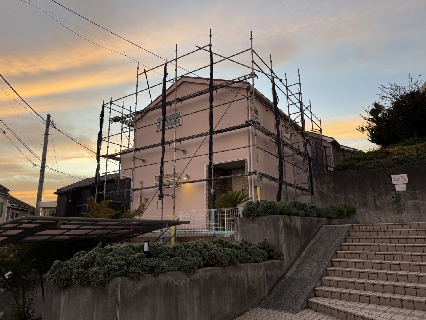 本日もお疲れさまでした。空の色も綺麗でした。足場解体前にお客様にも見てもらえるようにメッシュシートは絞っています。本当は足場の上で確認してもらう方が良いですが、揺れるし高いしで危険ですのでこの様な形で確認して頂いております。後は動画を撮影しております📷