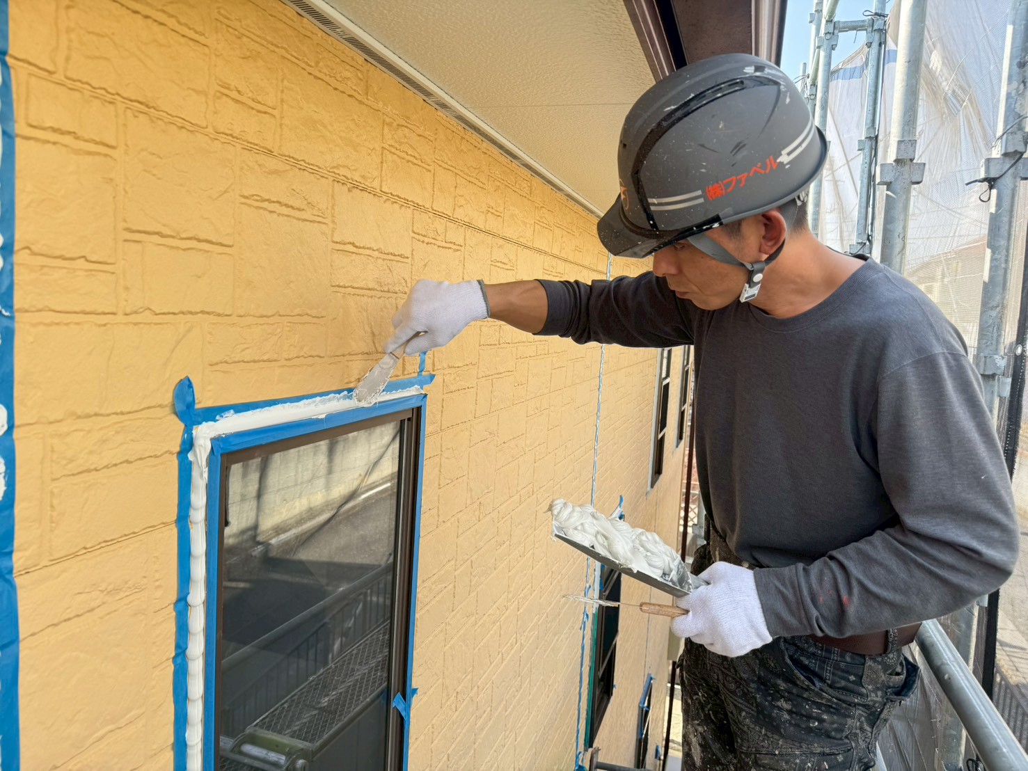 さて本日も横浜市旭区東希望が丘🏠古いシーリングを撤去したら新しいシーリングの打ち込みです!ホームセンターで売っているシーリングではなく職人専用のシールとシールガンを使用👀当たり前ですが💦中にヘアーが入らないようにしっかりと充填していきます。中にエアーが入ると後からぷくっと膨れてきます…しっかりと打たれていない証拠です。涼しい顔して売ってますが内心は本気の真面目👀後から私が仕上げて行っているので尚更緊張度が増しているかと思われます(笑)頼りにしている佐藤親方✨シーリング材はオートンイクシードです✨
