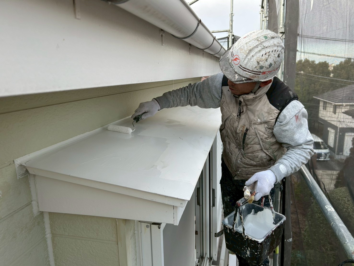 屋根はお昼近くまで濡れてしまっているのでそれまでは他の作業を行って乾くのを待ちます🌞庇などの錆止めやシール処理などの塗装前の下準備作業。顔出しNGで塗っていますのは私萩原です(o^―^o)ニコ