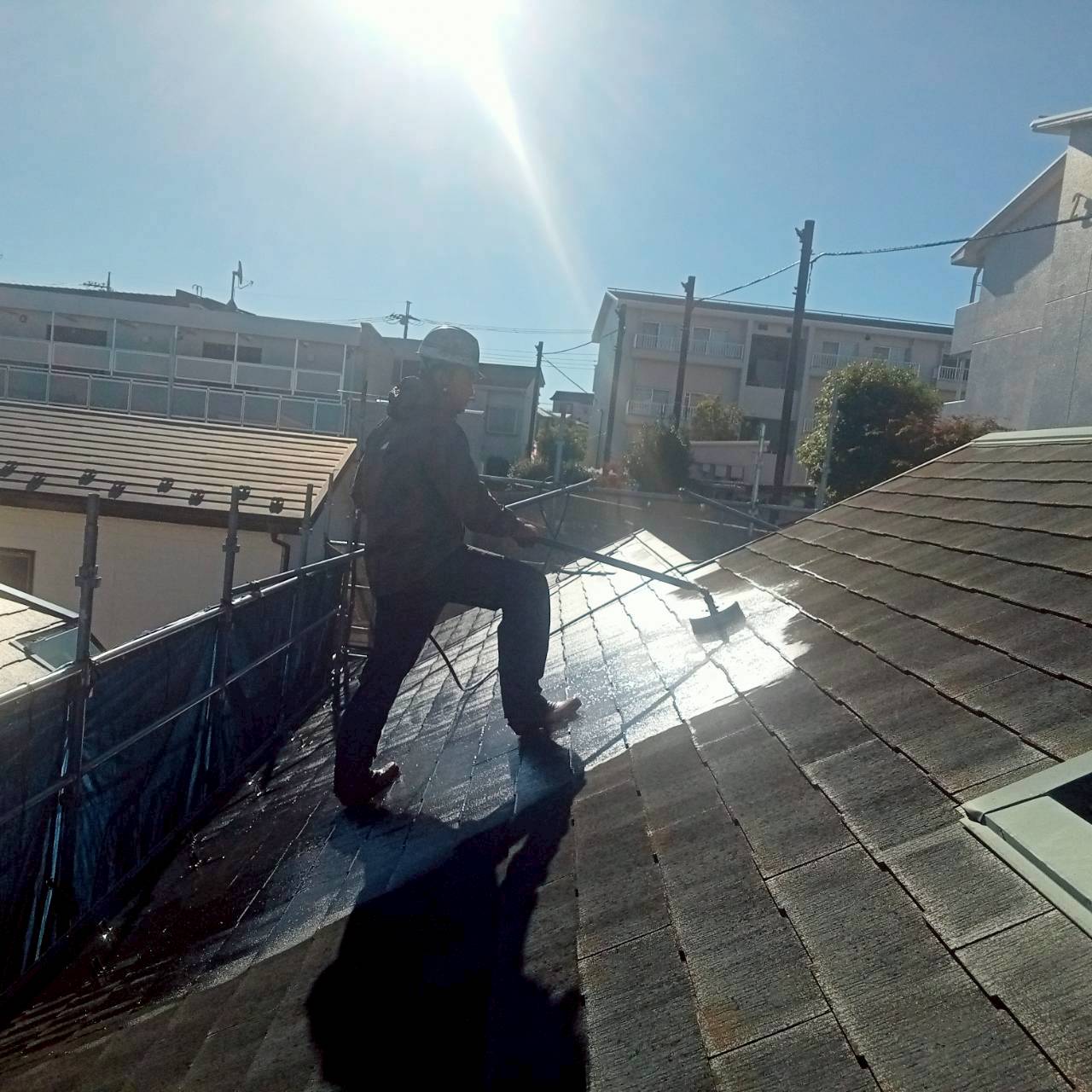 屋根洗浄。注意するべき点は落ちない事!です。下から洗っていくのがコツなんです。洗ったところはコケも藻もないので滑らない✨上からは怖くて洗えません💦本日も良い天気で、お陰様で施工写真も映えました。
