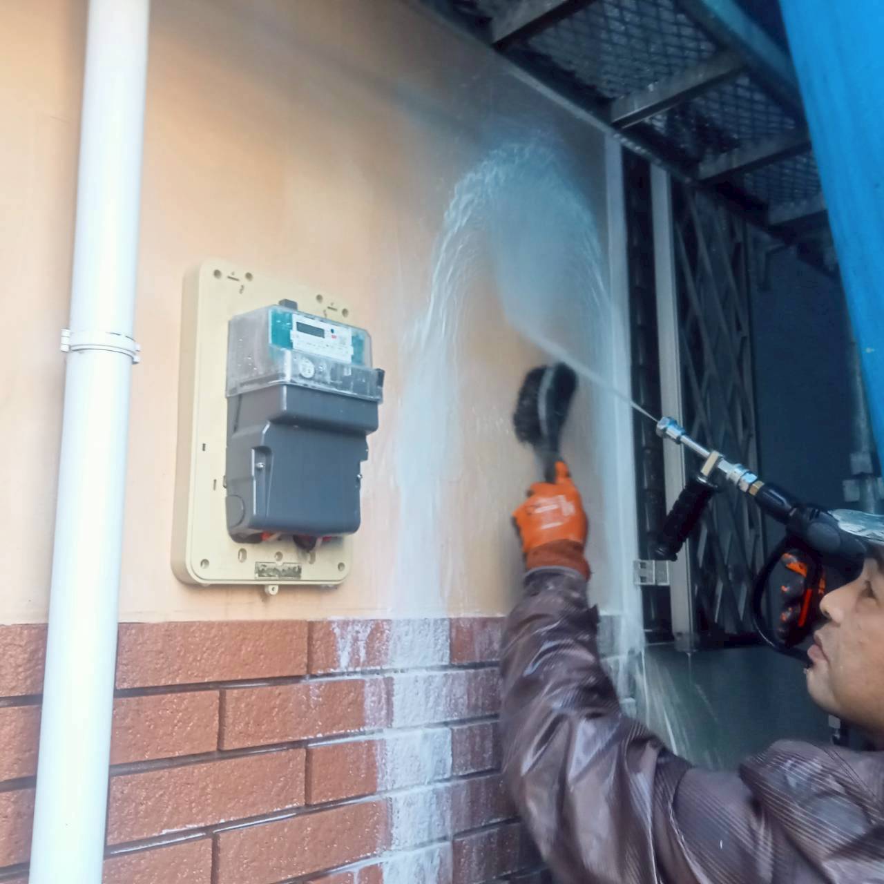 薬品洗浄。バイオ洗浄とも言います!施工順序はまずは普通に洗浄していき、そしたら薬品を混ぜた水で圧を弱めにして全体に噴射!ブラシなどでゴシゴシして、程よい時間で再度水で綺麗に洗い流して行くんです!合計3回の洗浄となります。しっかりと薬品を洗い流さないとこれからの外壁塗装にも影響が出てしまいますので念入りに✨