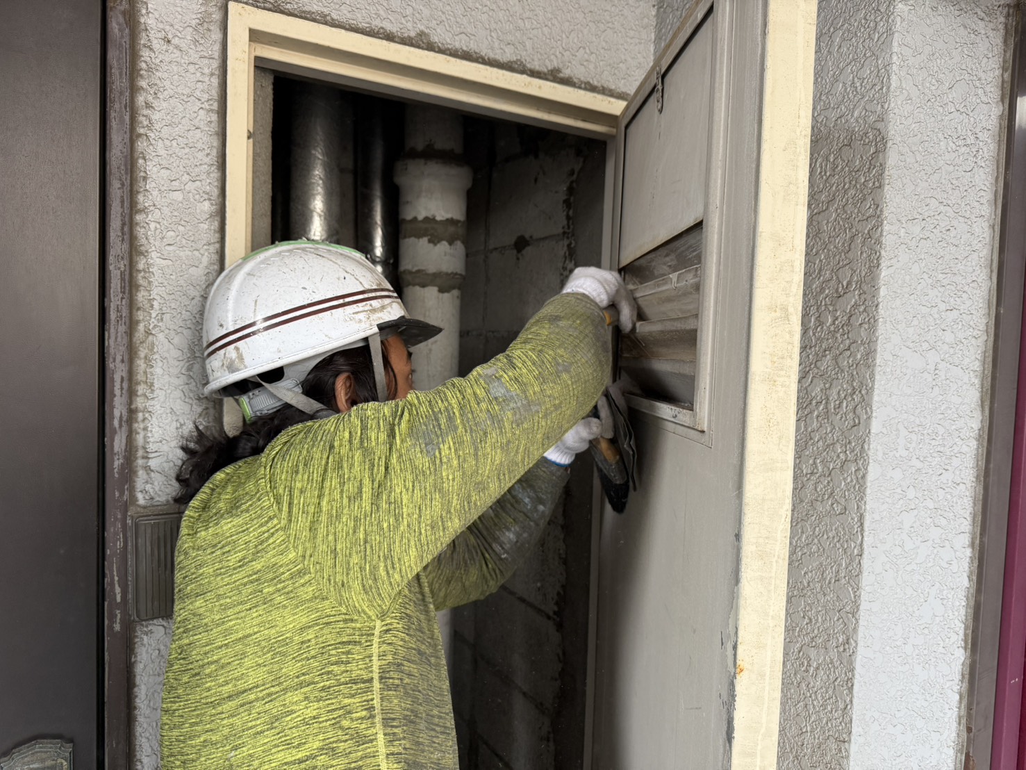 足場屋さんが高い所で危険作業中に私達は安全な床のある廊下で鉄部塗装の前段取り。研磨と清掃、そして養生です。これを終えてから錆止めに移ります✨長年積もった埃などを綺麗にして塗料の密着性と防錆効果を高めます✨