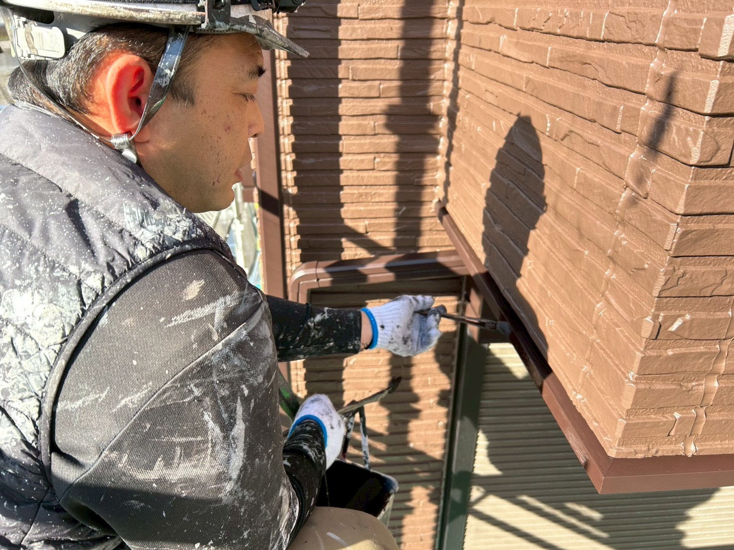 旭区の現場もいよいよ大詰め👀水切やシャッターボックスなどの上塗りが各所で行って最終仕上げに入りました。塗装屋さんにしては意外と珍しい(私の世界だけですが)左利きの三浦親方✨でもご飯は右といろいろと不思議な三浦親方(笑)