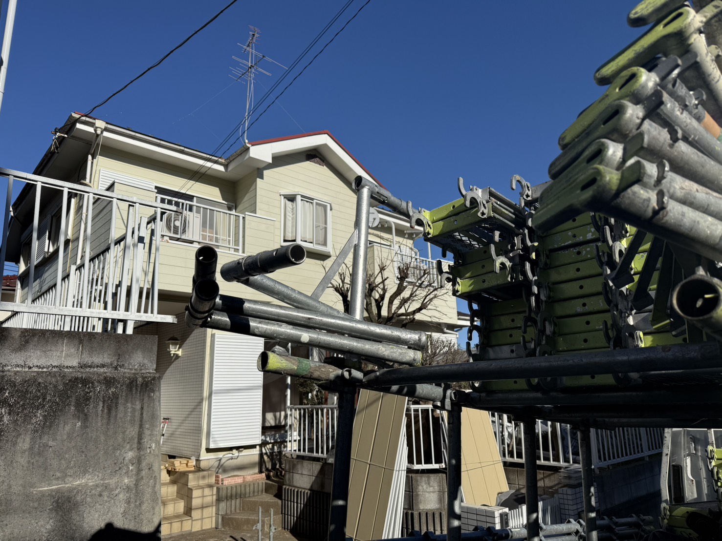 こだわり塗装のゆうちゃんの一発目の施工現場👀足場組立が本日2棟行わせて頂きました。正月明けなのでしっかりと準備体操と朝のミーティングを行い安全を高めスロースタートで体を整えて行かなくてはいけませんね。
