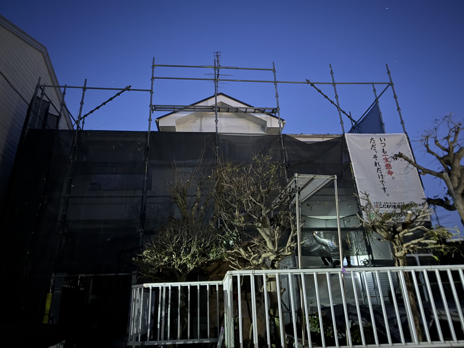 強風の為、メッシュシートは上部を外しておきました。強風時の足場のメッシュシートは屋根より高い所や角は開いておくと風にあおられることも少なく安全対策一番です✨