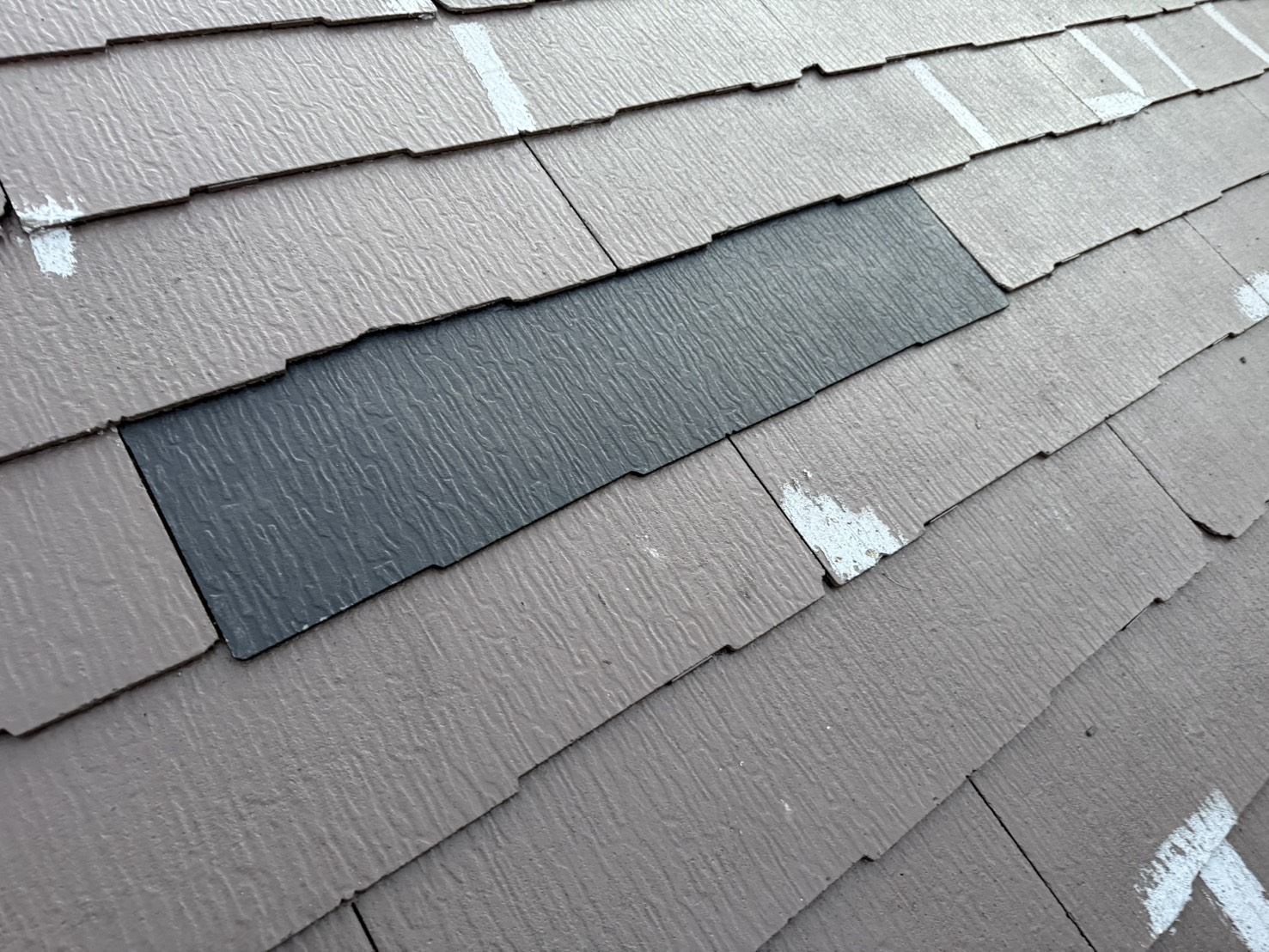 今回は約3年位はカバー工法や葺き替えを行わずに行きたいというご要望でしたのでひび割れは屋根補修材のタスマジックやシーリングなどを併用して補修し、もうボロボロで掛けたり割れたりしてしまっている屋根は差し替えを行いました。