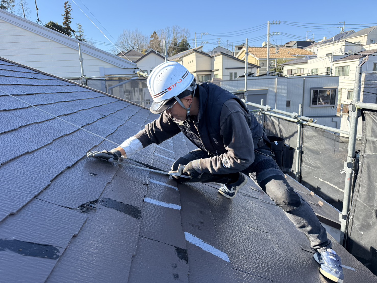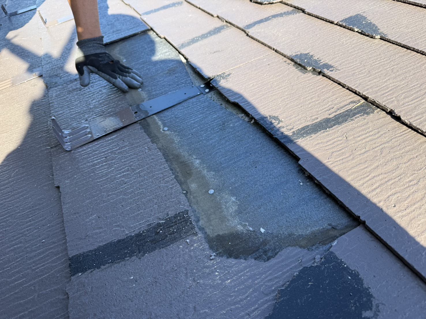 屋根工事にはカバー工法や葺き替えなどの数多くの種類の作業があります。その中でも一枚単位で行える補修方法、カラーベスト差し替え作業。専用の工具を使用して一枚だけ取り外し、新しい屋根材を入れ込むんです。全体的に行う事は非常に良いですが屋根工事はとても高額な工事です。なるべくは既存の屋根材を活かして行きたいところです。防水シートの寿命が30年付近なのでそれまではカバーや葺き替えなしで過ごしていければ良いと思いますがメンテナンスを後回しにしてしまうとそうもいきません。特に屋根は💦