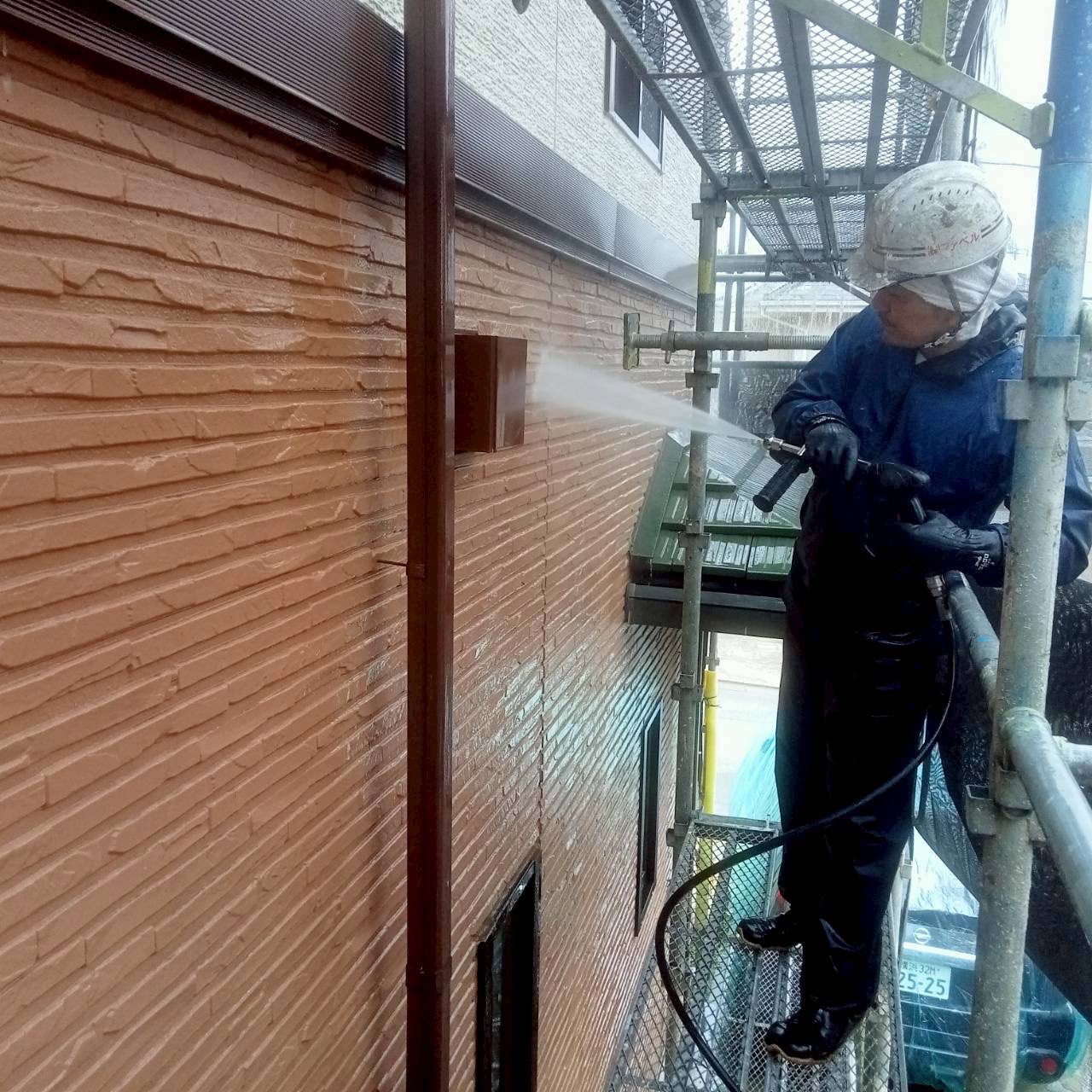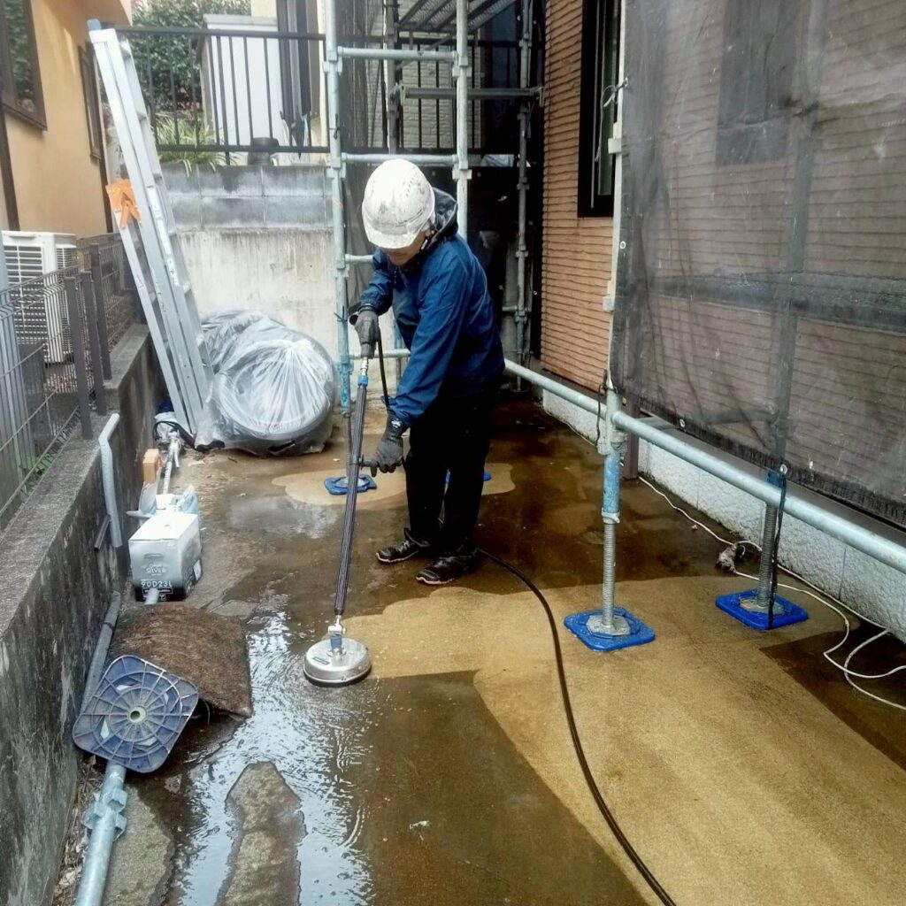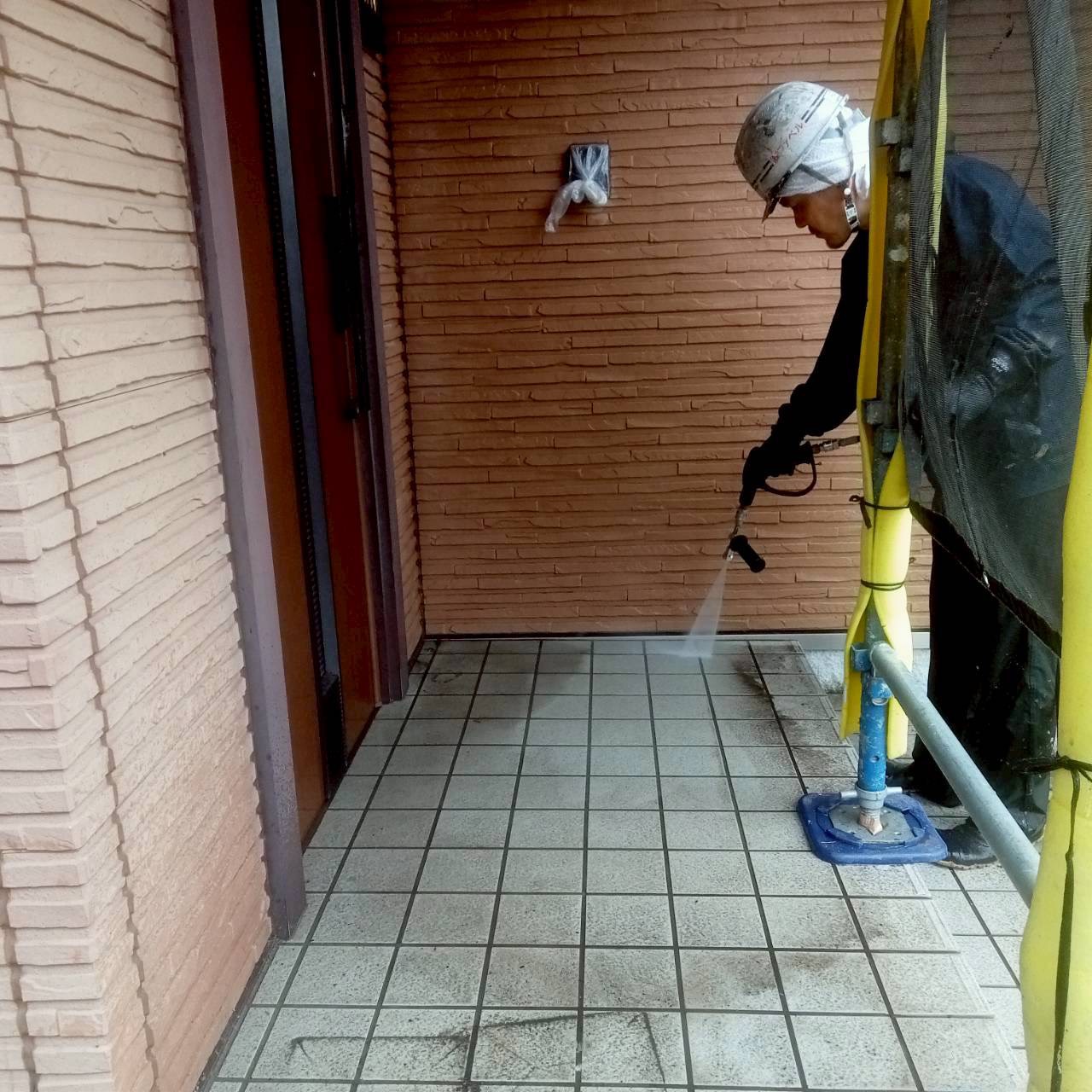 外壁塗装の始まりは、長年にわたり付着している汚れを落とす高圧洗浄👀ひたすらお水を当て屋根から外壁、普段洗えないサッシの上や網戸も綺麗に致します!上から順番に洗い流して行くと床はいつも真っ黒👀外壁に付いた汚れはとっても多いです💦