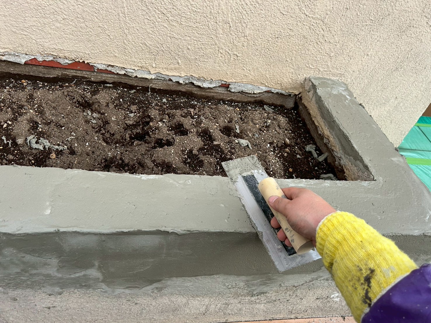 先日、脆弱した塗膜を剥がしきった外構の下地補修。しっかりと段差をなくしフラットに✨簡単そうで絶妙なコテ加減が必須。手に来る感触で判断していきます!職人はかっこよい✨言葉では何も説明できない位感触が物を言います✨だから基本的に無口になるのかもしれません💦