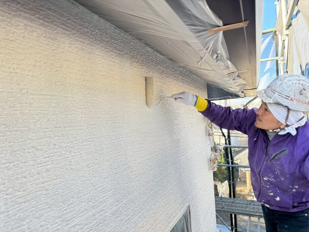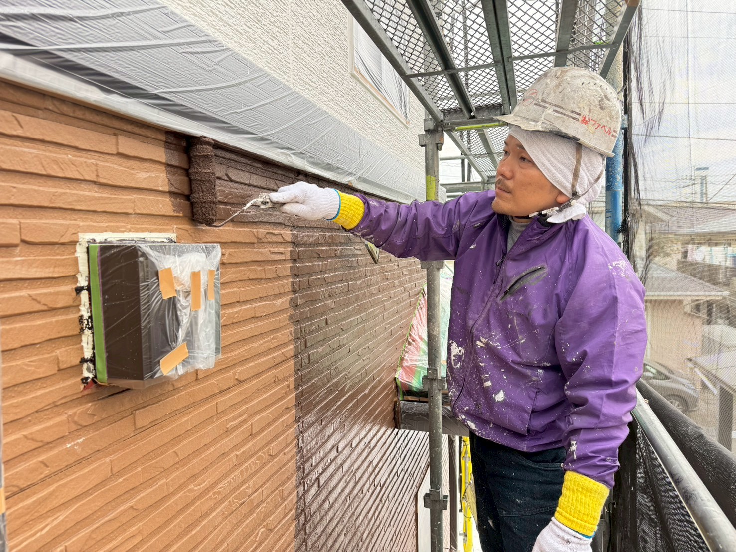 今回は上下で色分けとなっていますので交互に塗って行きます。上を塗って、乾燥させている間に下を塗って💦作業人数は早すぎず遅すぎずが理想ですので2人から3人が一番適しています。屋根が塗装の場合は4人位いても良いですが✨