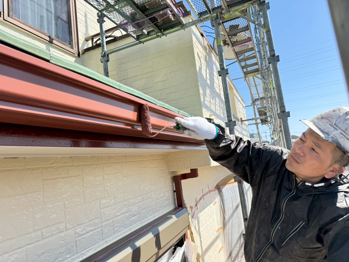 本日は佐藤親方・萩原の創立コンビです。写真撮ってくれない佐藤親方…作業に夢中です。彼も塗料というものに心を奪われている一人ですから✨外壁が完了したら養生を剥がし、庇や雨樋などの付帯部の仕上げに入ってきます。絶対に塗料を垂らさない!腕の見せ所。流石に下にウッドデッキや室外機などがある場合はしっかりと養生していますのでご安心を。