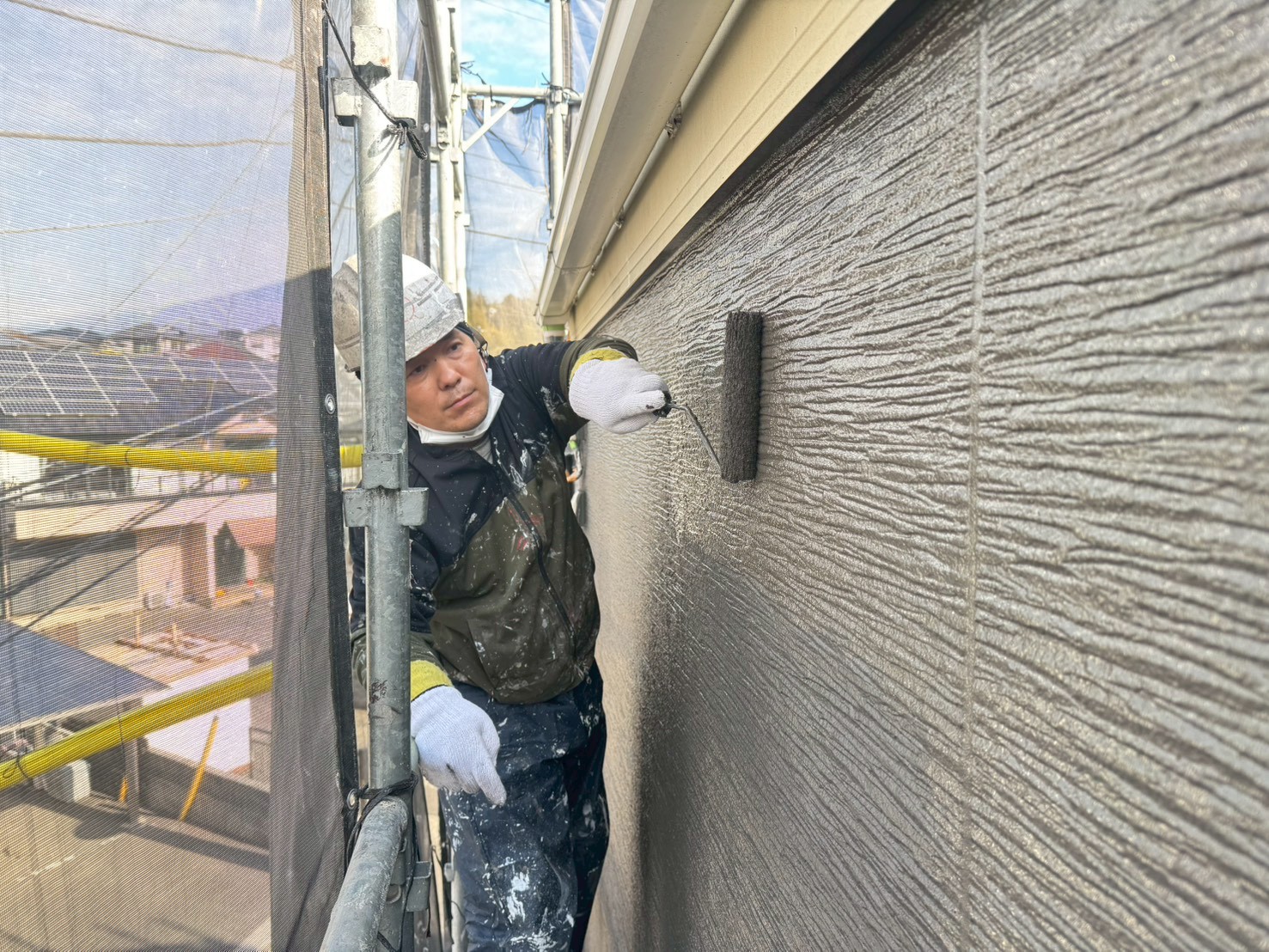 外壁も上塗りです。こちらもSK化研のプレミアム無機。最強の組み合わせで高耐久性狙い👀破風の塗料を積み忘れたと問題も発生しましたが、そこは長年の技術でカバー👷どんな事が起きても対応が出来る手に職は良いものです✨もう30年か~長いようでアッという間。佐藤親方も気が付いたら25年の経験値👀あっという間に年を取りました(笑)