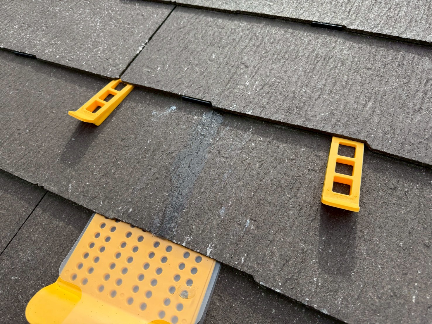 屋根補修はシーリングで行われている場合を良く現場調査で見る事があります。シーリングは厚みが1センチ、幅が1センチ無いとその効力は発揮することなく数年で切れたりしてしまい屋根には応急処置でしかありません。屋根の割れなどの補修は二つです。一つは屋根材そのものを新しい屋根材と変える『差し替え』です。もう一つは『タスマジック』です。話すと長くなるので検索して見て下さい💦屋根専用の補修剤で両面接着は行えるし強度も抜群。補修跡も目立たなくて最高です✨