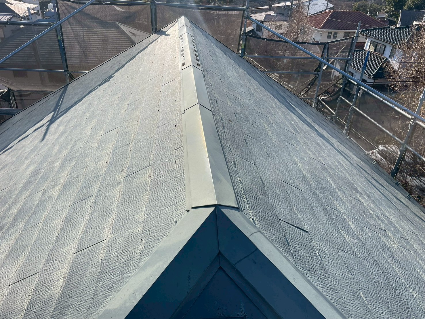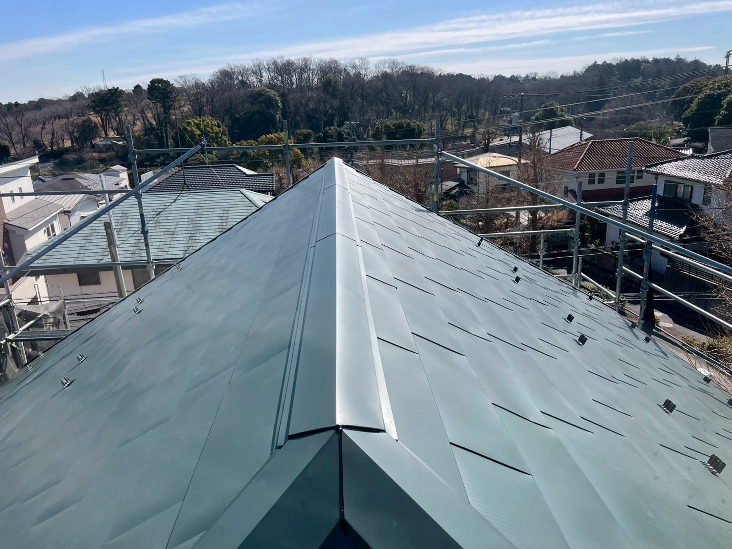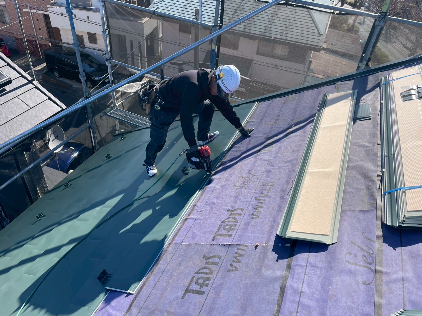 防水シートの寿命が25年~怪しくなりますので、新しく防水シートが施されるとまた安心して下せます。お色は既存に合わせたグリーンで決定✨冨樫親方が想いを込めて施工しました。