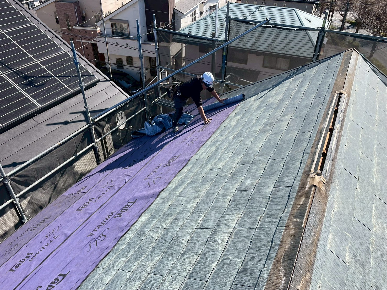 カバー工法は既存の屋根材の上から防水シートを張って行きます。棟板金や雪止めは撤去します!屋根材の撤去や処分費がかからない為カバー工法は費用が葺き替えに比べ安く行えますね。