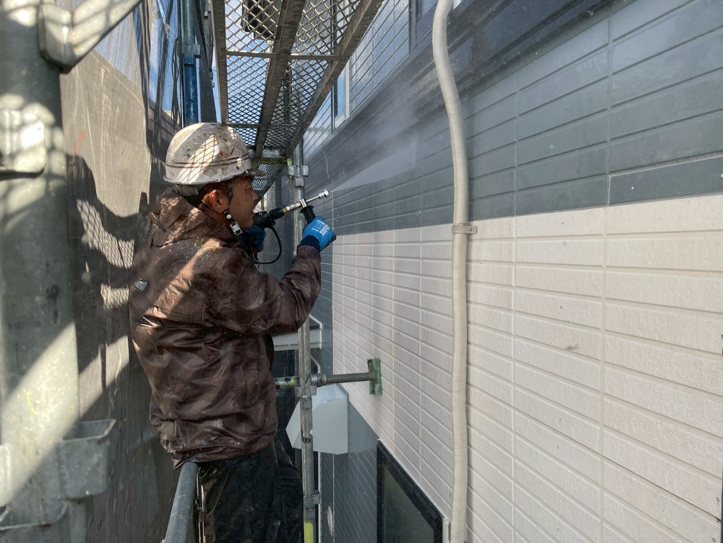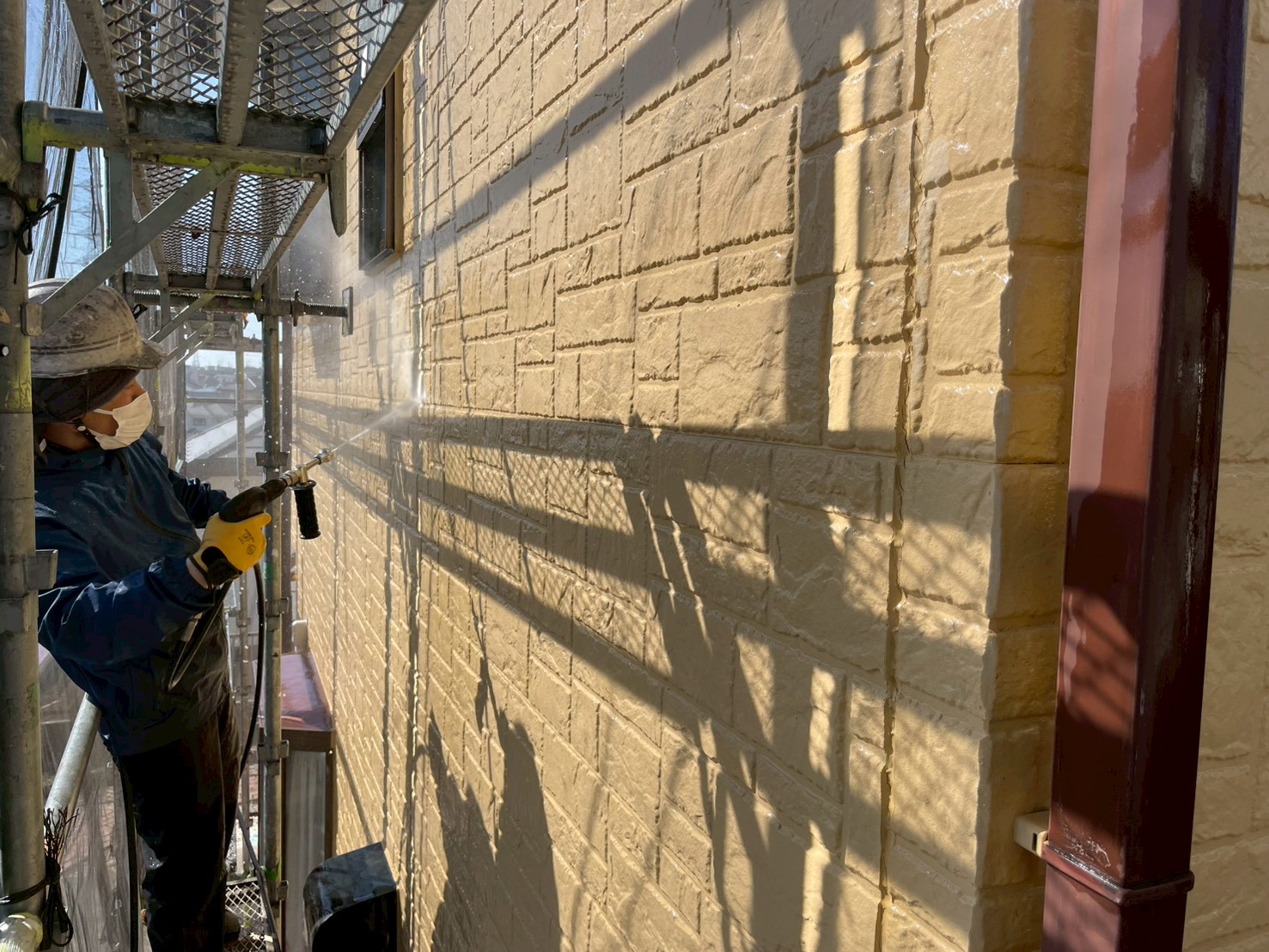 外壁塗装には欠かせない洗浄作業。長年にわたり外壁に付着しているコケや汚れなど綺麗に洗い流してきます。気温も暖かい為冬場の洗浄とは違い寒さも軽減。来月から花粉の心配だけしています(笑)