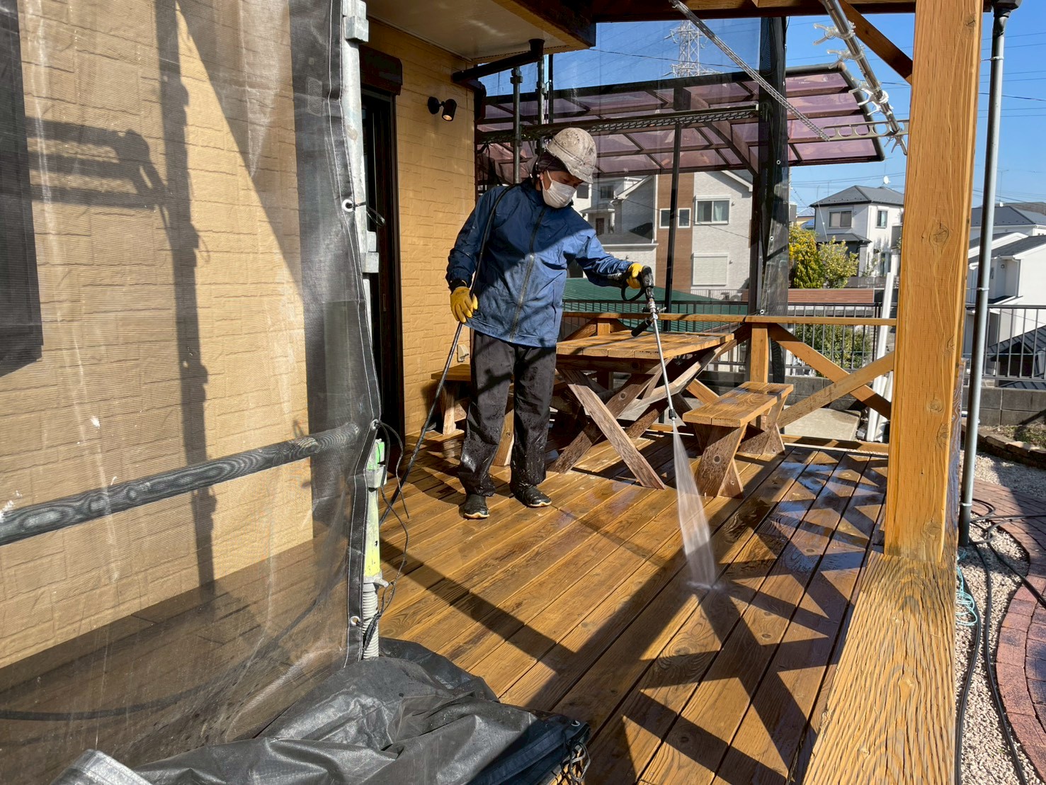 お洒落なウッドデッキは少し圧を弱めにして洗浄。手元のノズルで圧が調整できる優れもの✨プロ仕様の高圧洗浄機です👀