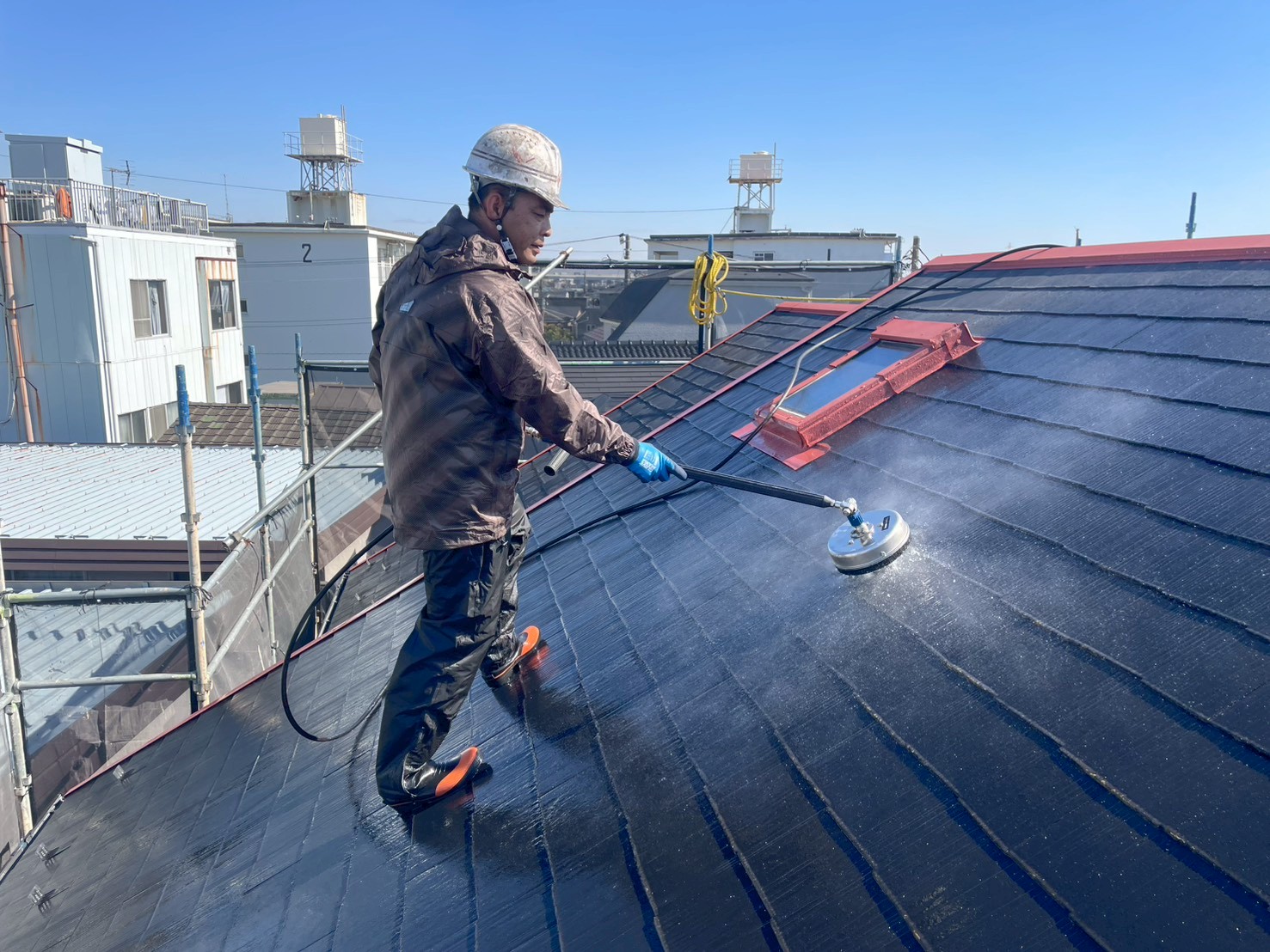 屋根の上では近隣への汚水の飛散を考慮しての円盤型ノズル。円盤内廻っている為周りへの飛散はこの円盤が守ってくれます。こだわり塗装のゆうちゃん基本屋根の洗浄はこれで決まりです✨