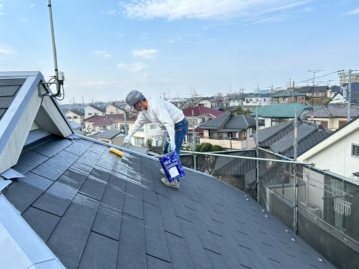 本日は屋根の下塗りです。シーラーと言う材料を塗って行きますが液体なので写真の様に自分に向かって流れてくるんです💦これを踏んでしまったらもう転落です。滑って立ってられません。しかしそこは30年以上の経験者✨適切な量で塗って行くので問題はありません!今回の屋根は築10年の為表面のコーティングもしっかりと残っている為下塗りがしっかりと表面に密着して塗膜が形成されます。この様な屋根は無機塗料などの高耐久性の塗料がとても最適です。傷みが少ない素材には是非無機塗料を。長持します!