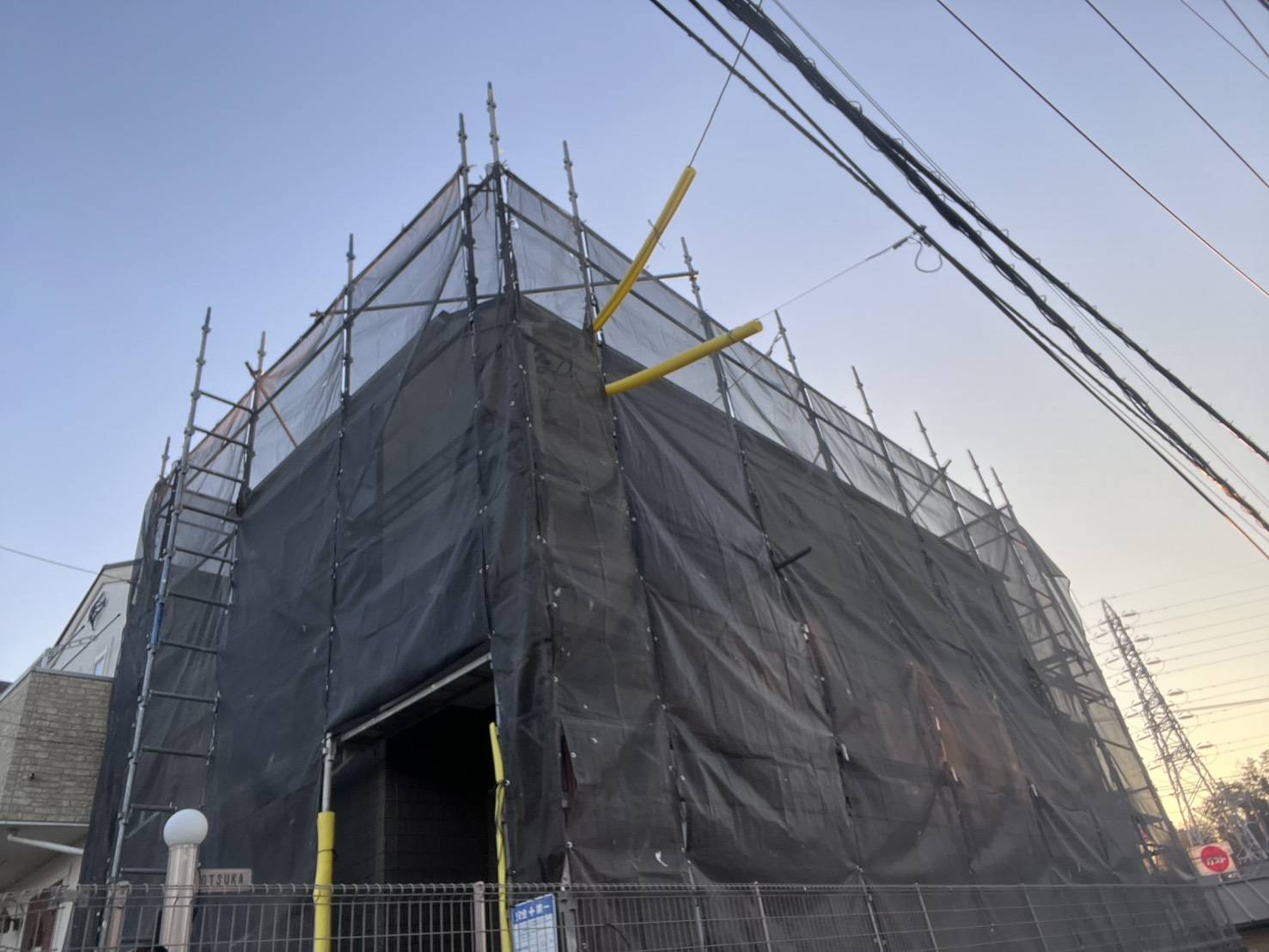 本日は足場の組立。開始一週間前に工事のご挨拶で近隣を回っており、お車の移動や金属音などの騒音などのご理解も頂いておりましたので安全に組立を行えました。皆様のご協力があってとても感謝しております。しかし。この様な足場が数週間も立ちっぱなしなのでストレスなどを与えてしまってもいますので申し訳ないです💦