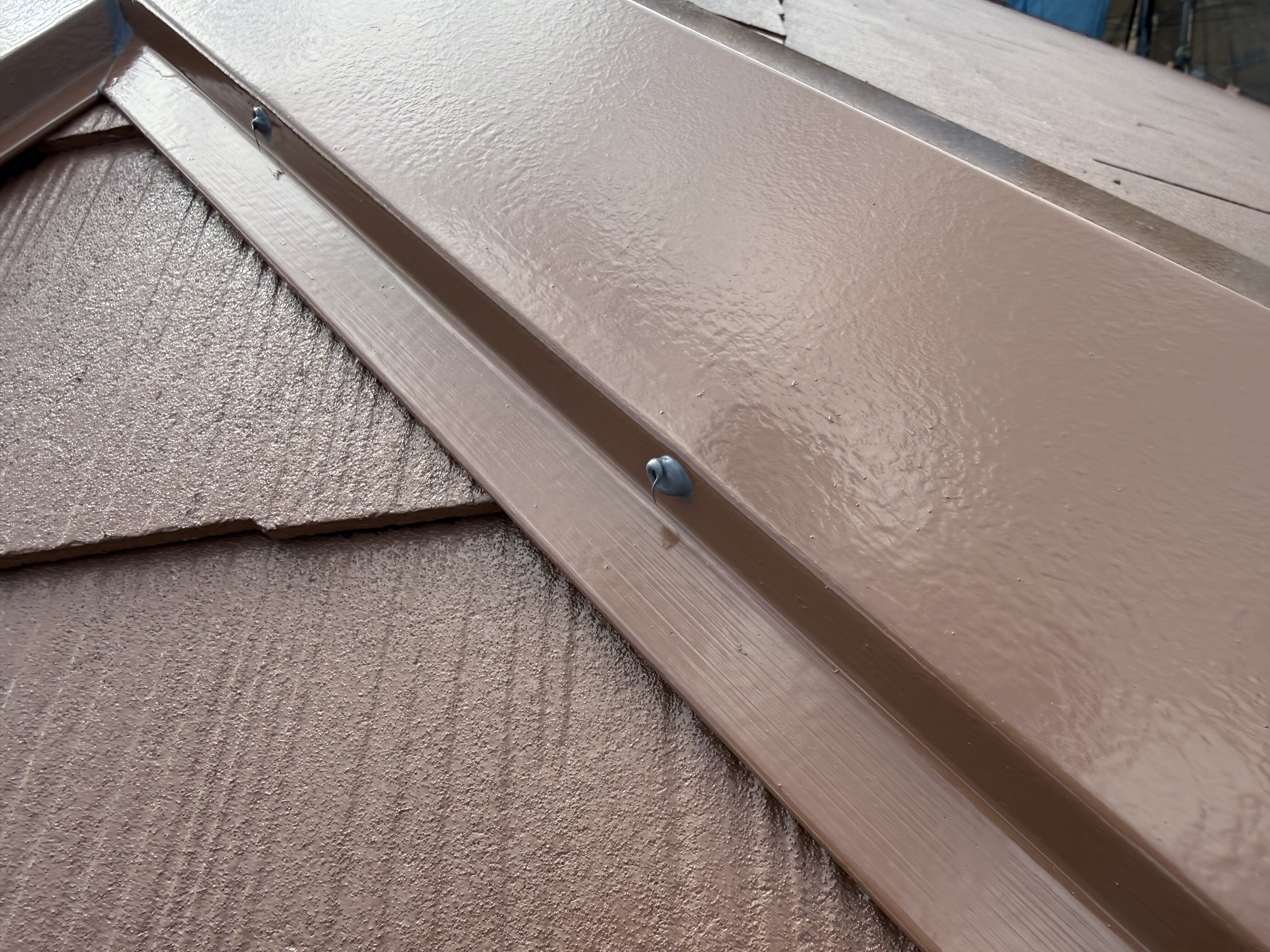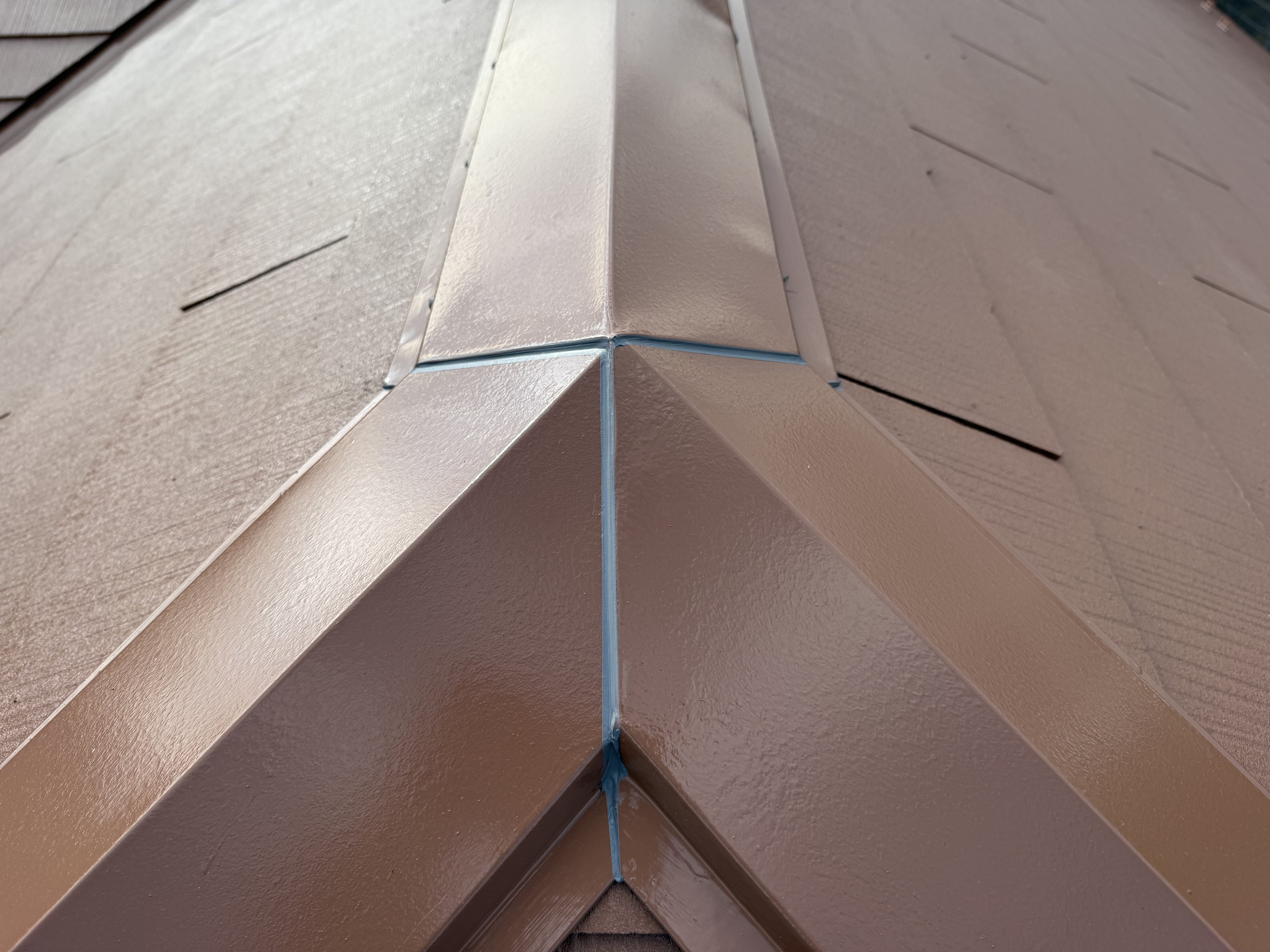屋根板金の頭頂部屋根塗装の際にシールの打ち替えを行います。現在中塗り迄完了している屋根🏠何故一番最初にシールを行わないかと思われる方もいるかなと?板金(ガルバリウム鋼板)ですので錆びて行きます。一番最初にシールを打ち替えるとシールの下には錆止めが塗布されていない状態となるんです。その為、古いシールを撤去しておいて、錆止めと中塗りをしっかりと中に塗り込んでからシールを打ちます。そうする事で中も錆の進行は遅れますし、また塗膜がしっかりと形成されていますのでシールの密着性も高くなります。密かな作業ですが大切なんですね✨
