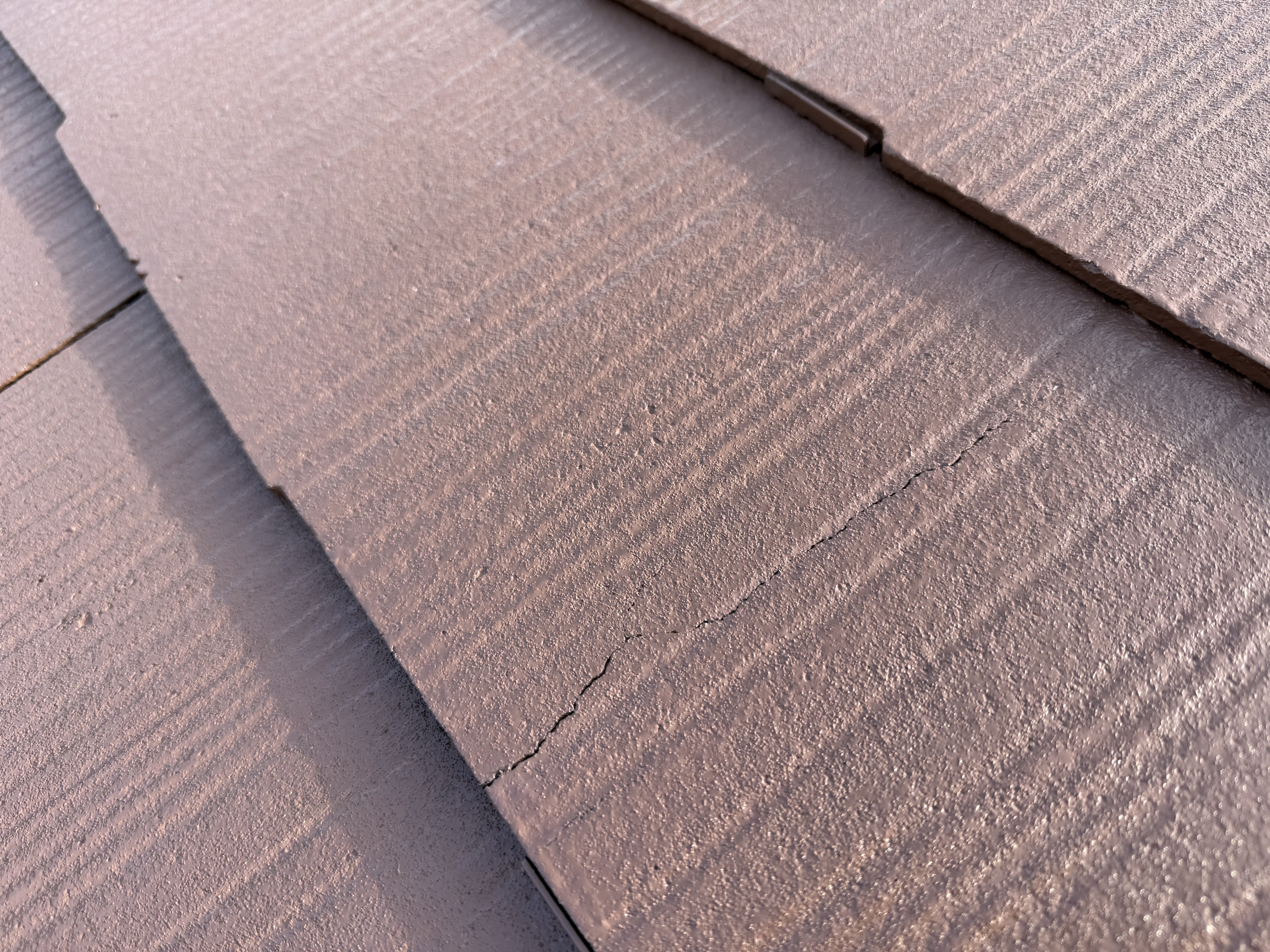 またこの様に塗装してから割れてしまうケースもあります。現場調査時には割れていない屋根材が何で塗装したら割れるの?普通に考えるとひび割れなどが起こる屋根材へ進行しないように屋根塗装を行うのに塗装して割れたら塗装の意味は無いんじゃないか?となりますよね💦劣化は目の見えない部分で進んでいるんです。塗料は屋根材に吸い込み、表面に塗膜が形成されてその繰り返しで塗膜が付いていきます。痛んだ屋根材は雨などを多く含み、そして乾燥。この繰り返しで中身はパサパサの状態へなって行くため、シーラーなどを吸収した屋根材は硬くなる場合もあり、柔軟性を失っている為この様に割れてしまう箇所も出てくるんです。その為、12年~15年には屋根塗装を行いましょうという事になります。まだ大丈夫。と見える屋根でもメンテナンスが15年以上など何もしていないと塗ってから割れてしまう場合もある為定期的なメンテナンスが必要なのです。