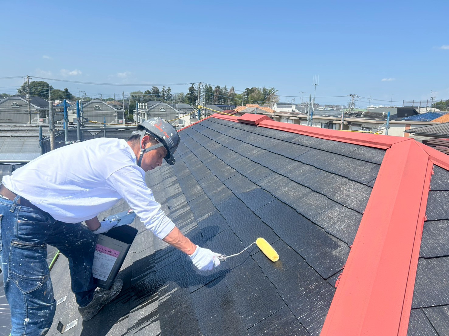 海の底とは正反対で空に近い屋根の上での塗装工事を行わせて頂きました。お客様からは見えない場所。見えない所もしっかりと施工するのが職人のお仕事✨まずは屋根材をしっかりと紫外線や太陽の熱や雨から守って行くための下地作りのシーラーです。既存屋根材と塗料の密着性と上塗りとの密着性を高める為に欠かせない作業工程。劣化が激しいと吸い込みが止まらない為2~3回塗る事もあります。表面が濡れ色になるまでは塗って行かなくてはいけません。それほど重要な作業なんです。