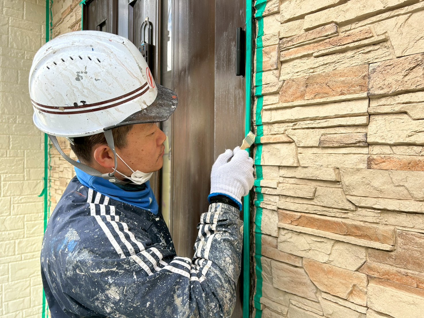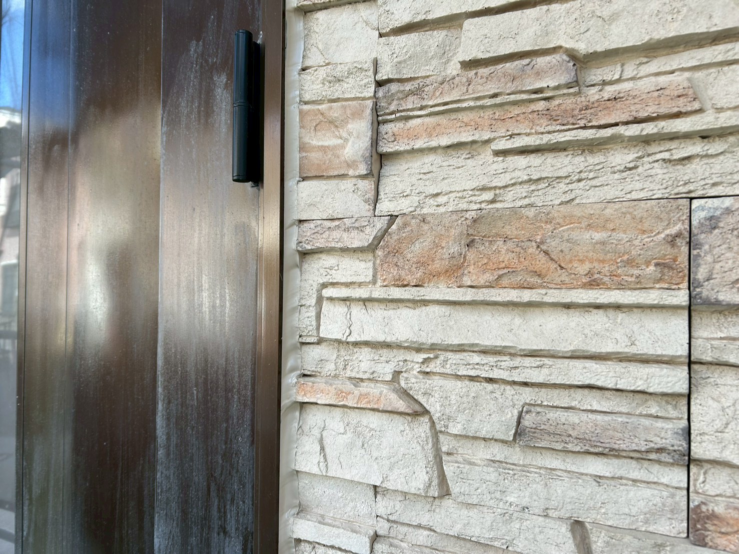 外壁目地やサッシ廻りのシーリングの打ち替えでは、塗装の前に打ち替えを行い、乾燥後にその上に塗装を行う先打ちでシーリングを行う事がほとんどですが、後打ちというのもあります。サイディングの場合ですとクリヤー塗装を行う時に良くやる工法です。また、写真の様に玄関とタイルや石面の場合も多いですね。後打ちとはシーリングを打って仕上げという事です。意匠性維持が出来ます。デメリットとしては難しいです。綺麗な仕上げを行わないととても目立ちます。テープからのはみだしも許されません💦