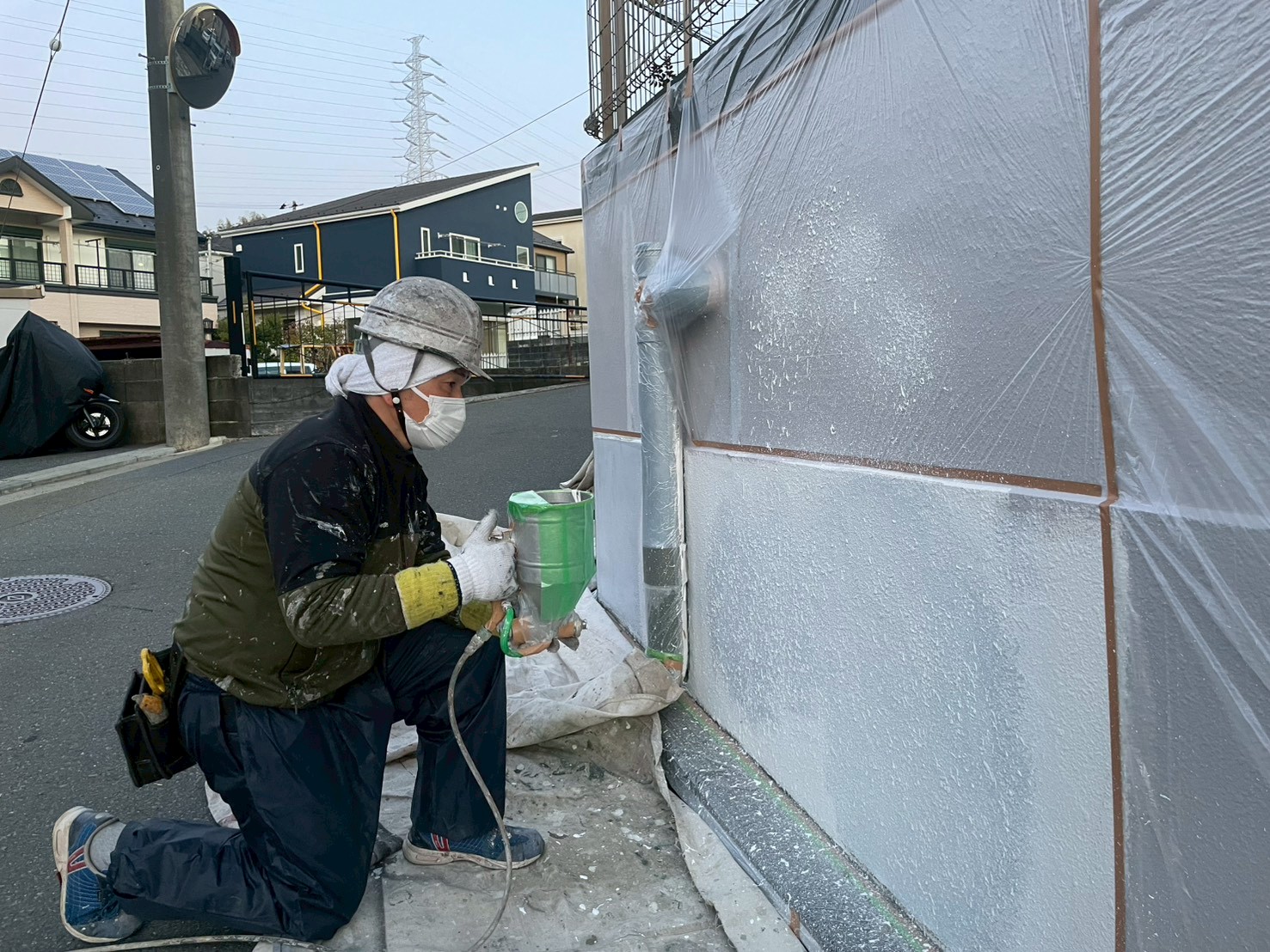 先日外構の下地補修を行いました。塗膜の剥がれと一部欠損。カチオンでしごいて完了したんですがちょっと汚いと納得が行かない佐藤親方。再度補修を行ってご満悦の様子でした(o^―^o)2回目の肌合わせを吹付!肌合わせとは既存の柄と合わせる事です。補修するとその面はツルツルになるので目立ってしまいます💦目立たないようにするのも技術の一つですが、納得いくまでやるのも職人気質で良い事ですね。補修などは隠れてしまう為わからないですが最後に綺麗になった。と言う言葉を頂けるだけで全て報われます✨