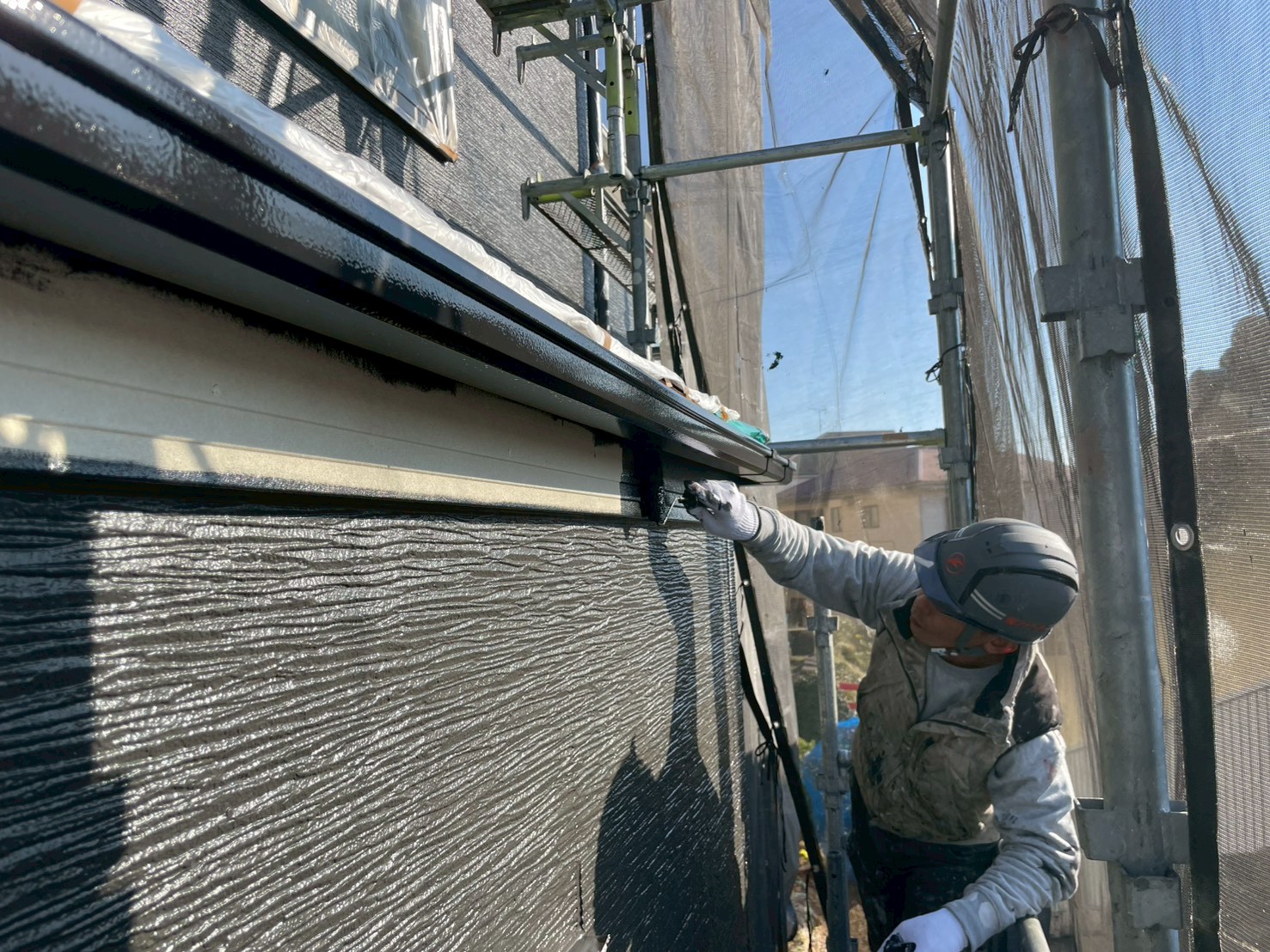 こちらは破風と樋の塗装。白からガラッと反対の黒で塗装です。どんな雰囲気になるのかお客様と私達ドキドキワクワクです✨