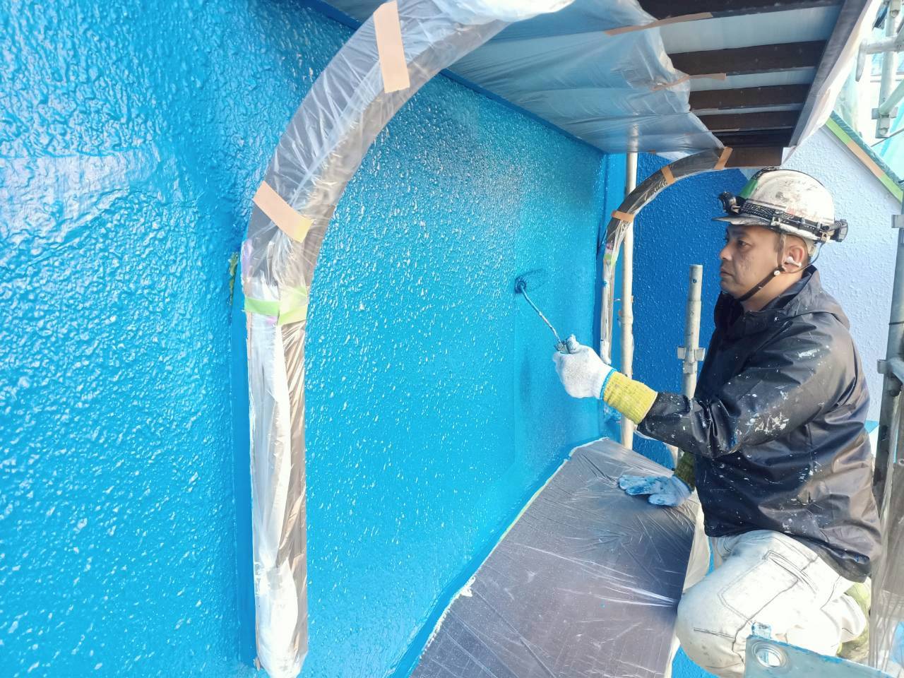 艶も塗膜も蘇り、建物の保護は完璧になってきました。クリームやベージュなどが多く人気の色ですがこの様な色の変化の現場ではまた違った楽しさがあります。しっかりと事前にお色の塗り板やカラーシュミレーションを行い後悔の無い、笑顔が自然と溢れるお色にイメージを近づけてからの外壁塗装を心掛けておりますのでご安心してくださいね