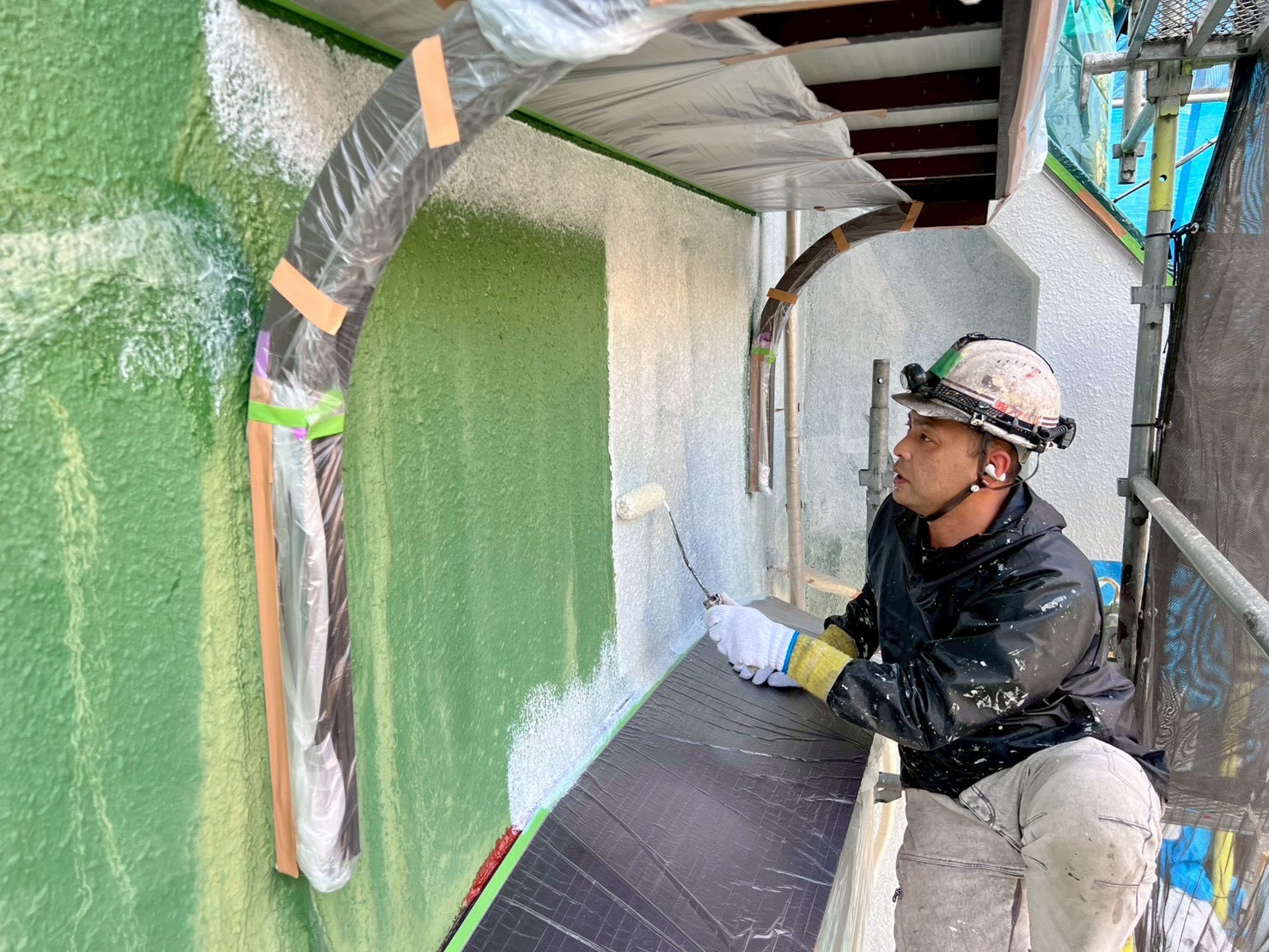 経年劣化により色褪せてしまった緑色の外壁。きっと塗ったばかりの時は清々しく鮮やかな緑色だったと思います。こだわり塗装のゆうちゃんでの施工では瑠璃色の様な、宝石のラピスラズリの様な、綺麗な青色に変化します♪幼馴染の三浦と一緒に外壁塗装工事✨