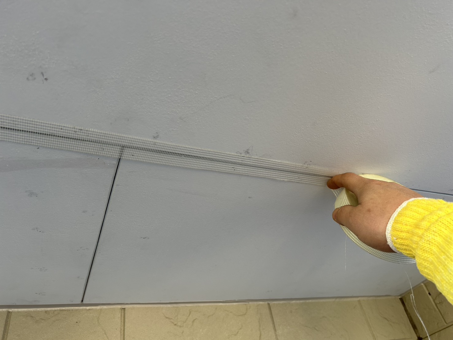 さて本題へ。この網は、ファイバーテープ・または寒冷紗と言います。ガラス繊維やポリエステル製のメッシュシートです。ひび割れ防止や下地補強として使われるものです。そちらをしっかりと張り付けパテをかって行くと割れづらくなります。お家は車が通るたび、窓の開閉などで振動が常に響いています。その揺れや振動に対しての予防策。でも一般住宅のほとんどが一枚張りとなっている為ファイバーテープを貼っても、ひび割れは起こりやすいんです。一番は2枚張りですね。ジョイントをづらして貼ってあるため力の分散されたり防いでくれます。