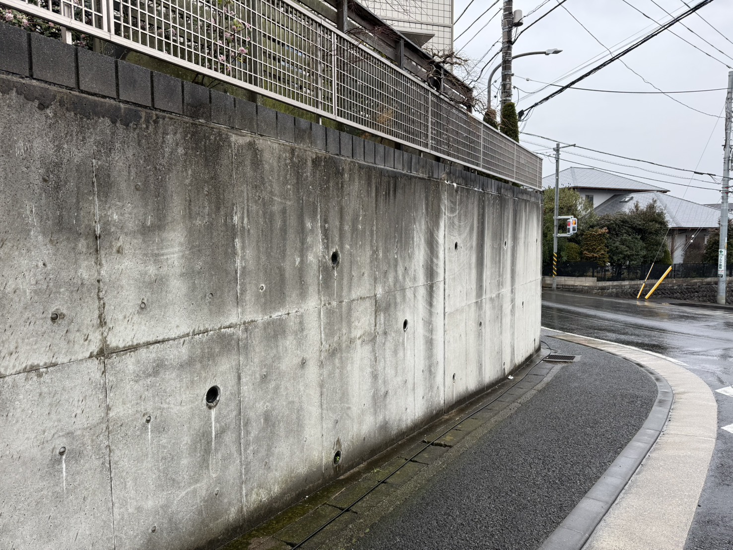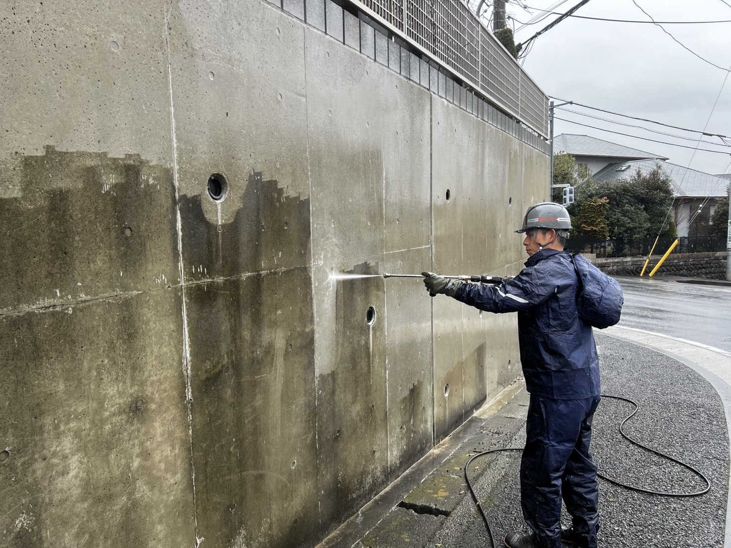 当現場は道路に面している為水の飛散など数多くの危険性があります。その為、雨天時に作業を行うと天気予報も含めたご契約✨お客様からは雨の寒い日にやらなくてもいいんじゃない?とお気遣いのお言葉を頂きましたが、歩行者や通行車両などがある為、晴れの日は少し作業のやりずらさや事故発生の項目が増えてしまうのです💦雨天だから大丈夫という事ではありませんのでしっかりと見張り役を立てた2人作業で行いました。