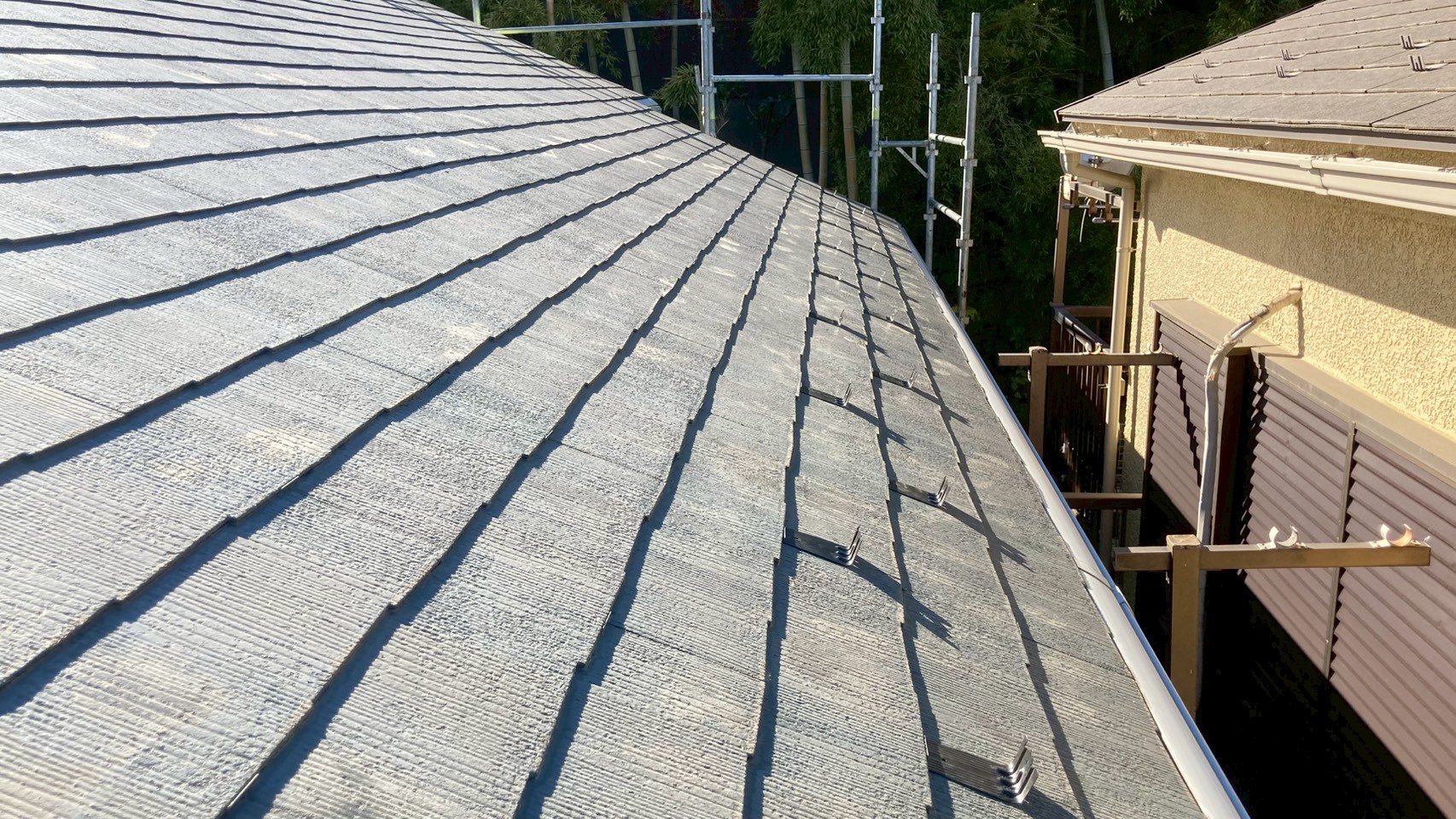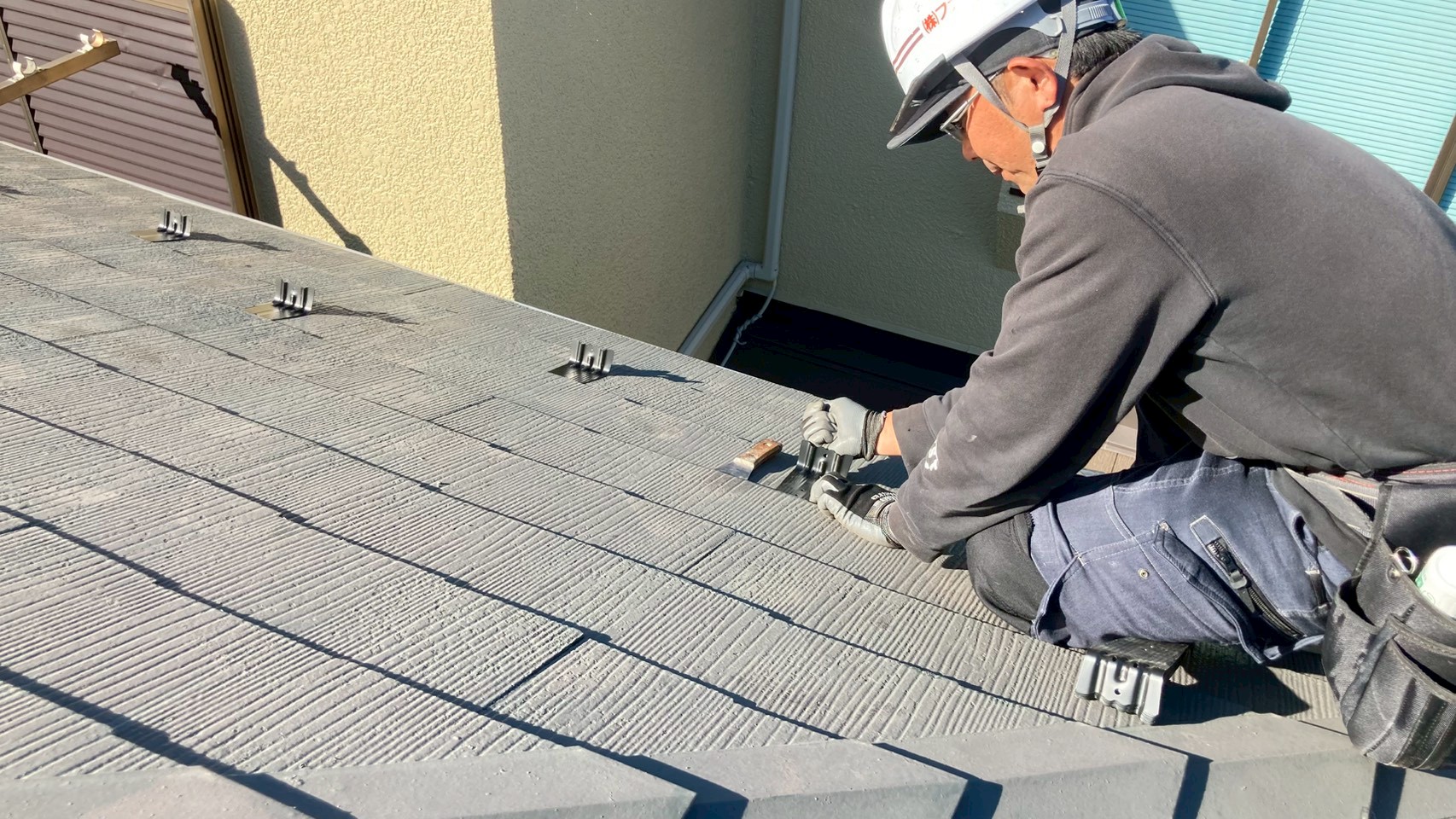 屋根の事なら、弊社の冨樫親方の出番です✨足場設置と同時に取付を開始。何故足場と同時かと言いますとベランダに波板があり撤去しないと足場が立たない為波板の取り外しに行かせて頂いた際に一緒に屋根の雪止めを取り付ける事となったわけでございます👀