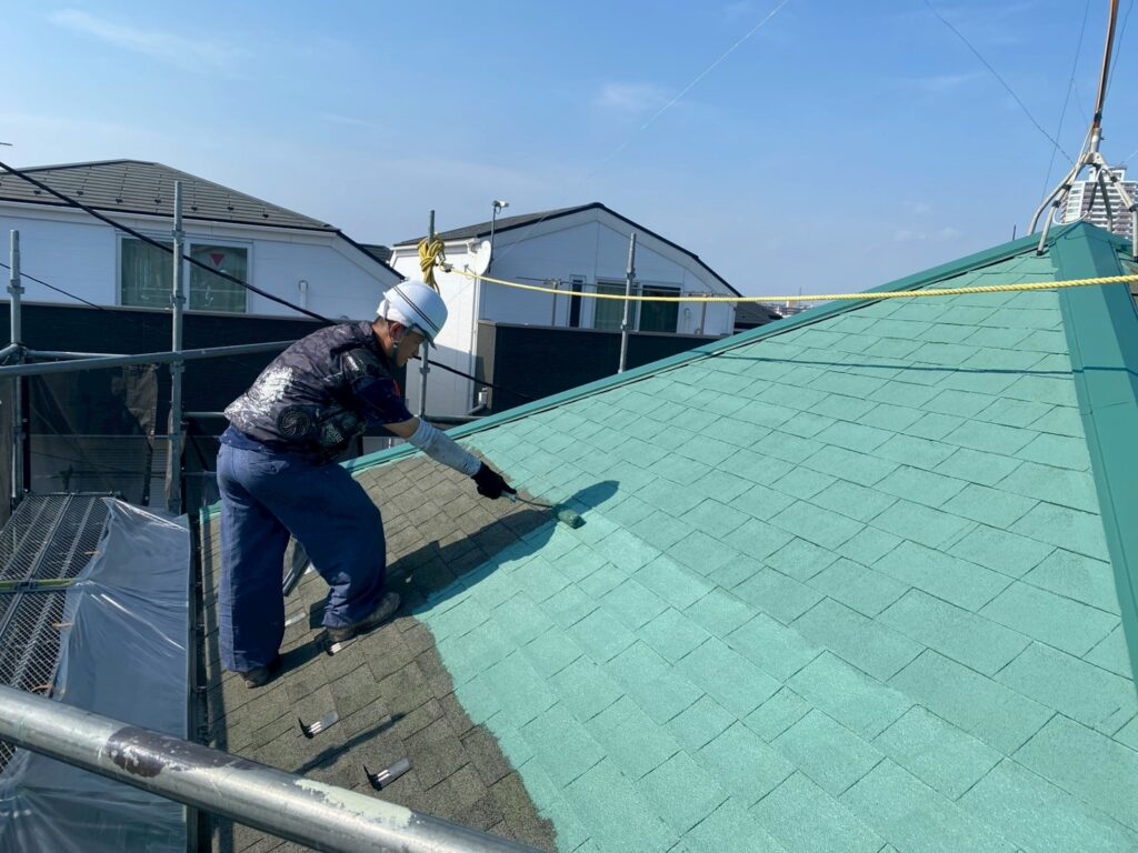 綺麗に洗って、十分乾燥させたら塗装の開始ですよね👀今回はグリーンの屋根へ。既存のアスファルトシングルもグリーン。お施主様もグリーンがお気に入り✨完成して早く喜ばせたい気持ちを抑え、ゆっくりと丁寧に塗り重ねていきます!